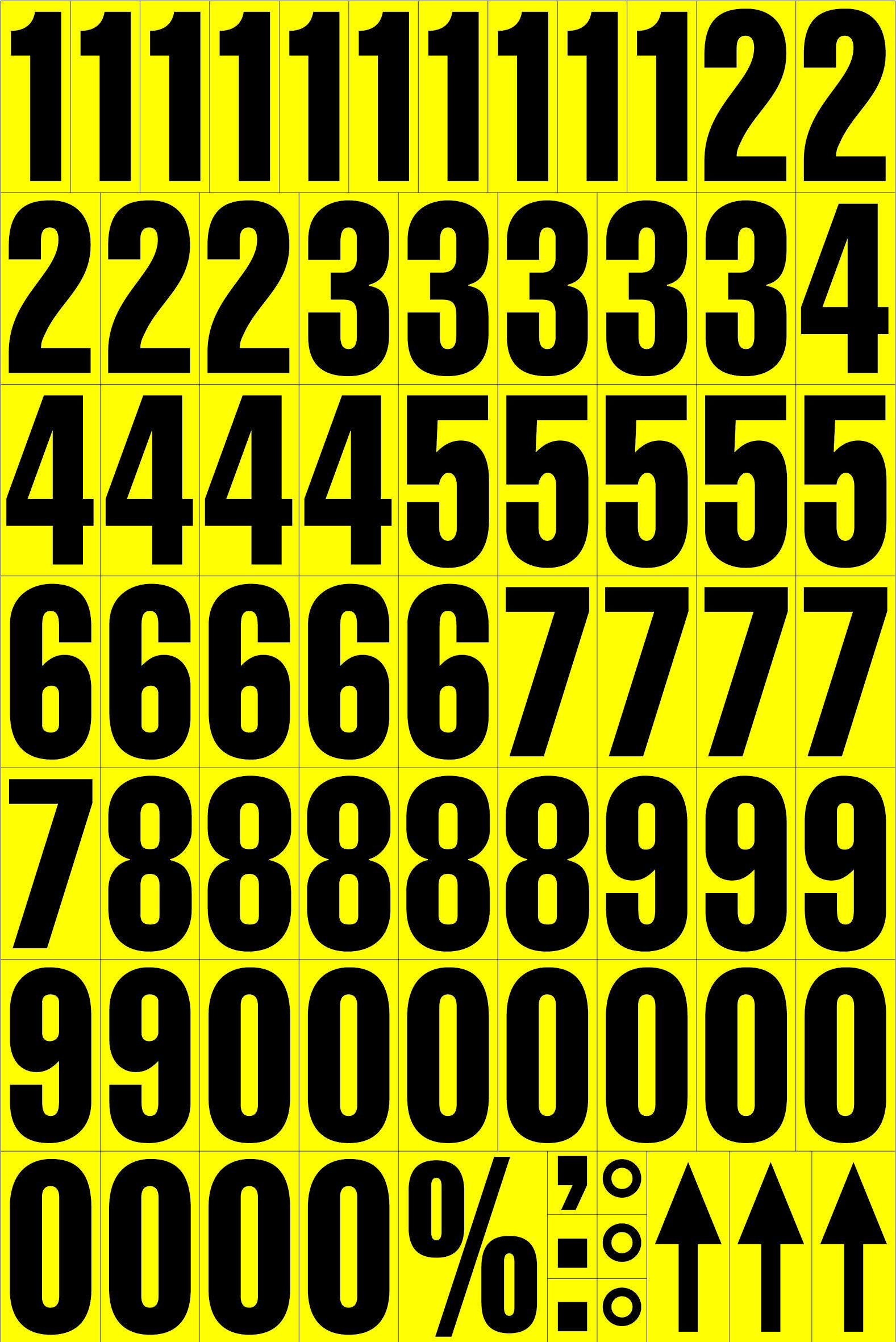 Bold black numbers from 1 to 9, repeated in a grid on a yellow background, designed using MH-USA Magnetic Mixed Numbers - H.1.69 in. Below are five zeros, percentage sign, forward slash, colon, apostrophe, and three upward arrows.