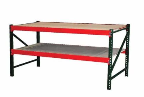 Heavy-duty stepped load beams and steel uprights create a rigid workbench that accepts 3/4″ particle board decking recessed into the beams for a flush top. A full-width bottom shelf provides secondary storage and improves stability. Boltless/step-beam assembly enables fast, low-tool setup; optional anchor plates are available for floor mounting. Durable powder-coated finish resists wear in busy warehouse and workshop environments. Keywords naturally aligned: industrial shelving, steel storage racks, boltless shelving, warehouse racking, heavy-duty shelving.