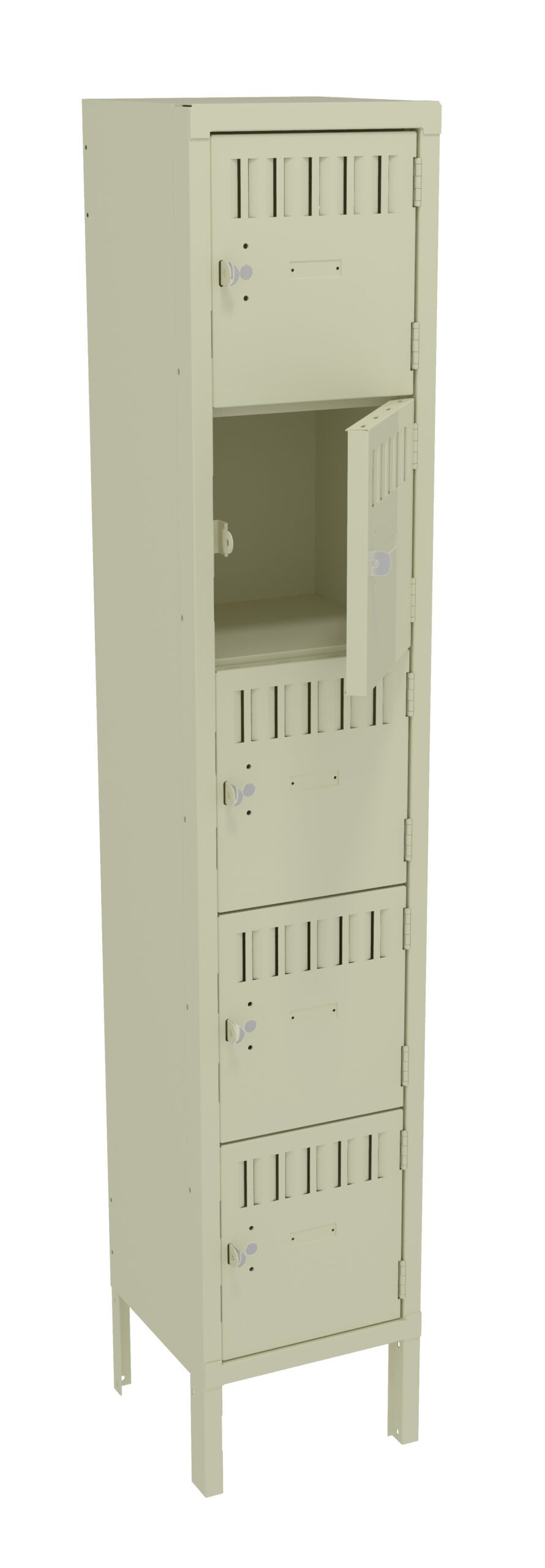A tall metal locker with five compartments. The locker is a light beige color, and the second compartment door is open, while the others are closed. Each compartment has a small vent and a lock. The locker stands on four legs.