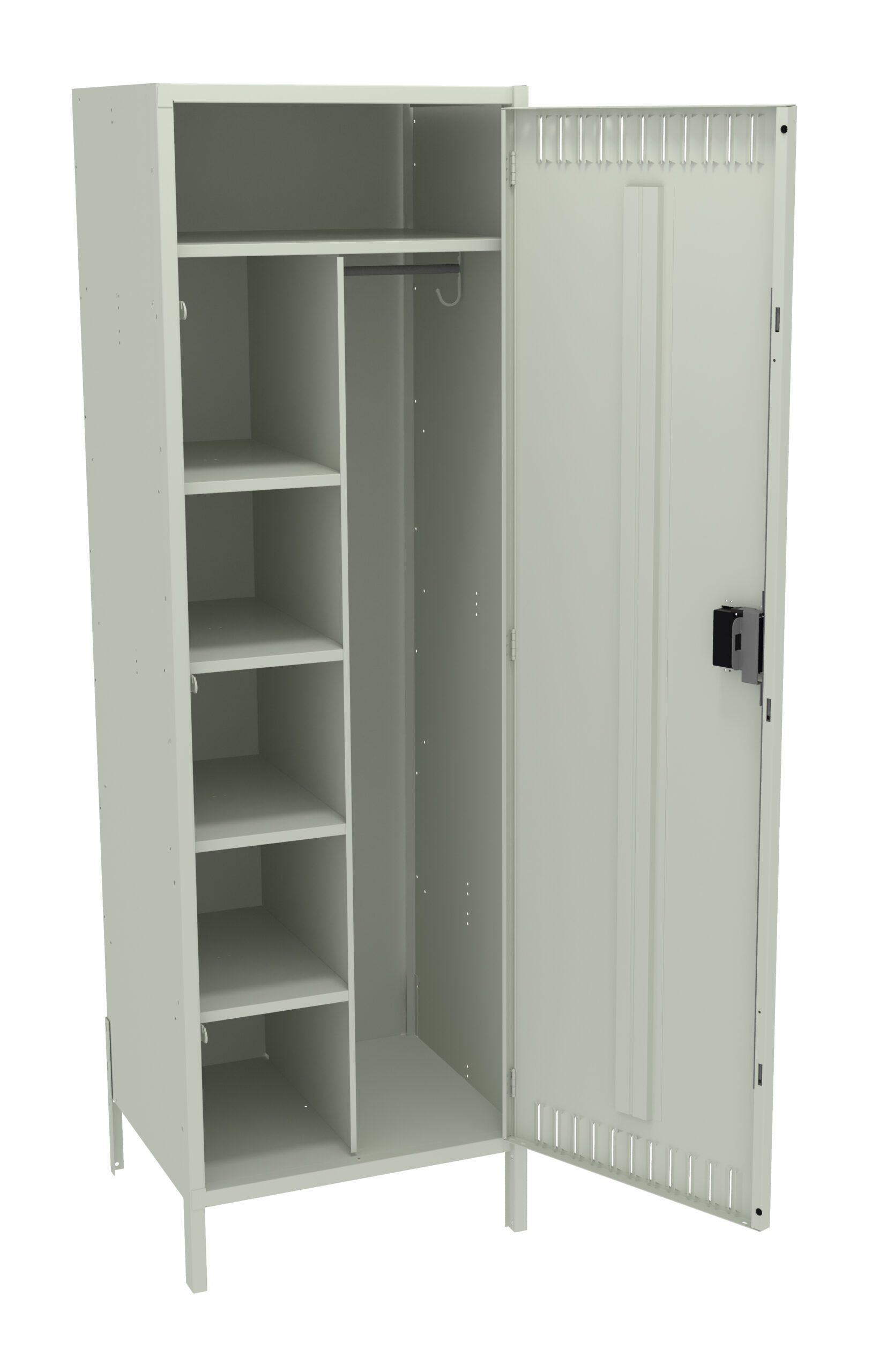 Deluxe, multi-purpose Combination Locker features a full width top shelf, five individual storage compartments and room for full length hanging garments. Door stiffeners for added rigidity. Positive 3 point locking system on doors. Flush louvers for ventilation. Lockers are welded and ready-to-use.