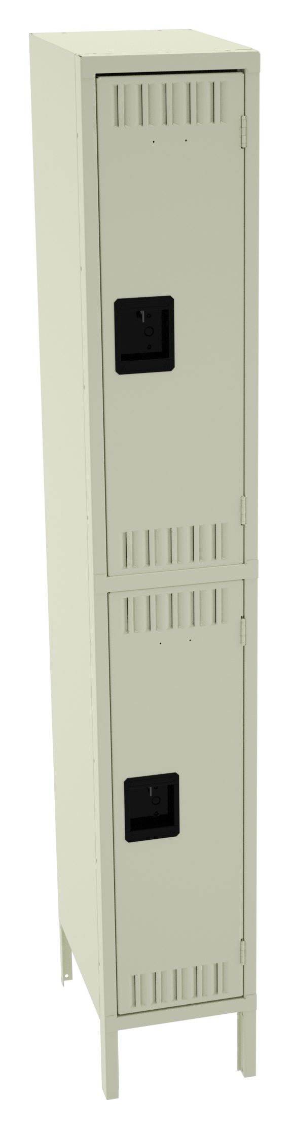 Double Tier lockers feature two openings per locker, giving you twice as many lockers in the same space as a single tier locker. Three coat hooks per opening. Positive 2 point locking system on doors. Flush louvers for ventilation. Door stiffeners add rigidity.