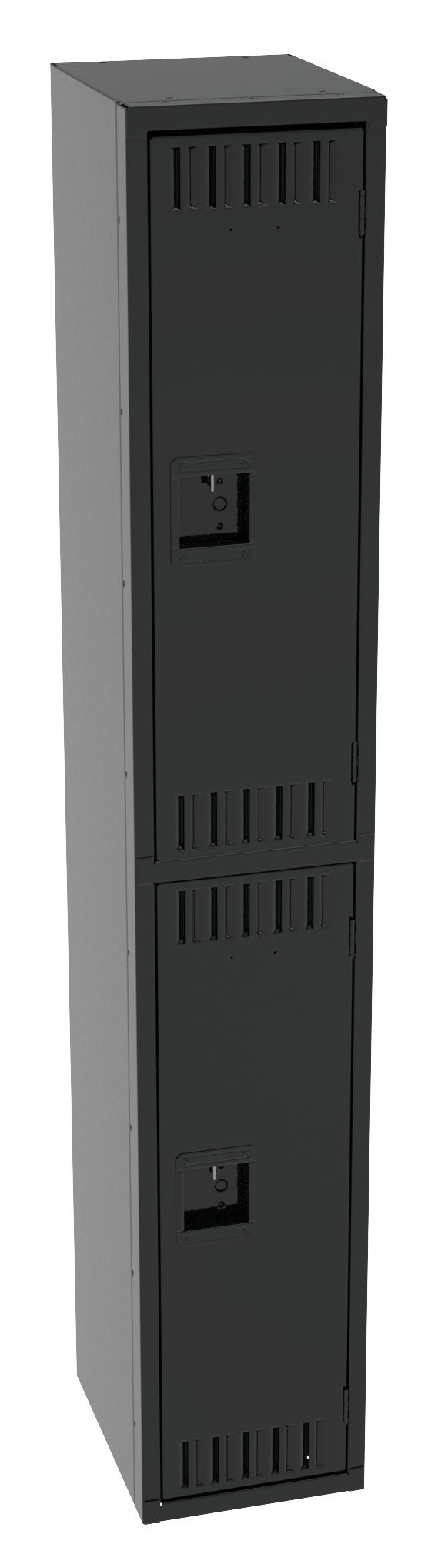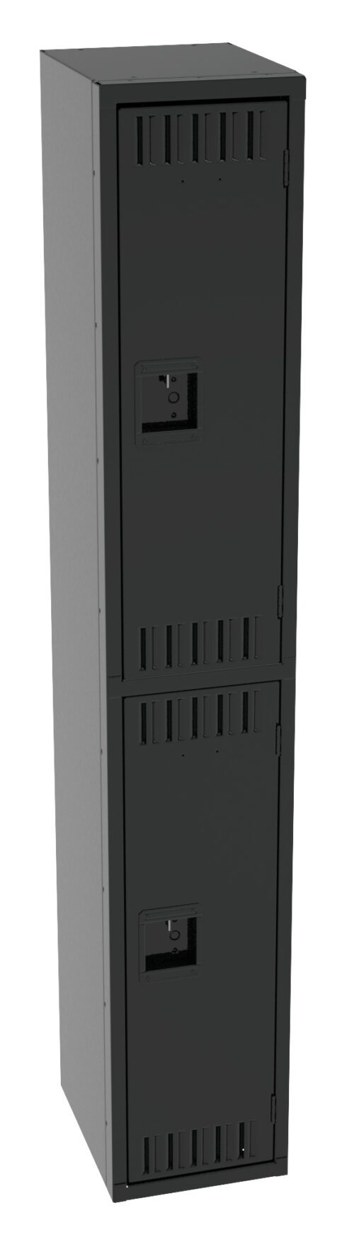 A tall, black metal locker with two compartments, each featuring a small vented section and a lock. The locker is standing upright with a sleek, minimalist design.
