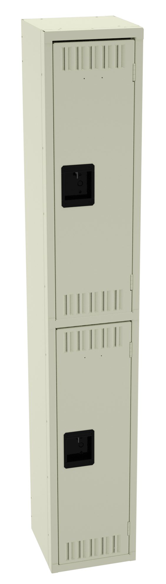 Double Tier lockers feature two openings per locker, giving you twice as many lockers in the same space as a single tier locker. Three coat hooks per opening. Positive 2 point locking system on doors. Flush louvers for ventilation. Door stiffeners add rigidity.