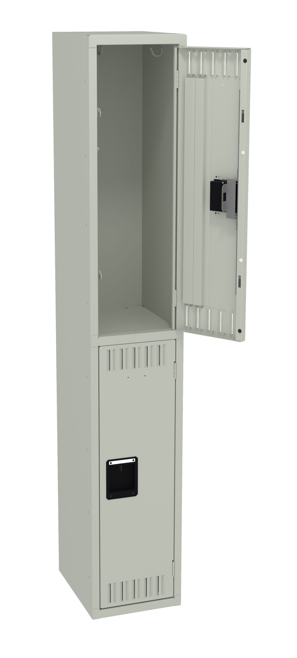 Double Tier lockers feature two openings per locker, giving you twice as many lockers in the same space as a single tier locker. Three coat hooks per opening. Positive 2 point locking system on doors. Flush louvers for ventilation. Door stiffeners add rigidity.