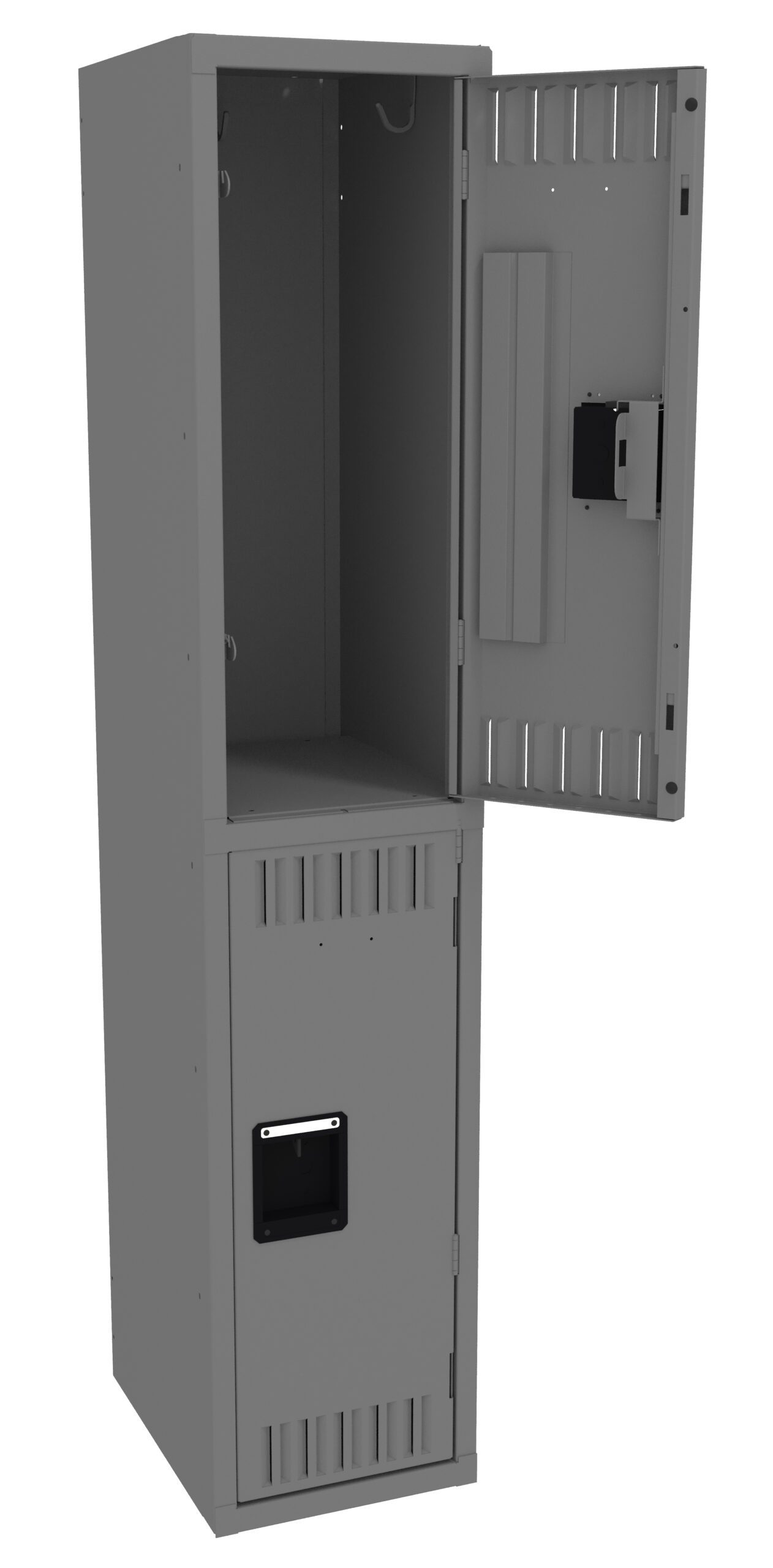 Double Tier lockers feature two openings per locker, giving you twice as many lockers in the same space as a single tier locker. Three coat hooks per opening. Positive 2 point locking system on doors. Flush louvers for ventilation. Door stiffeners add rigidity.