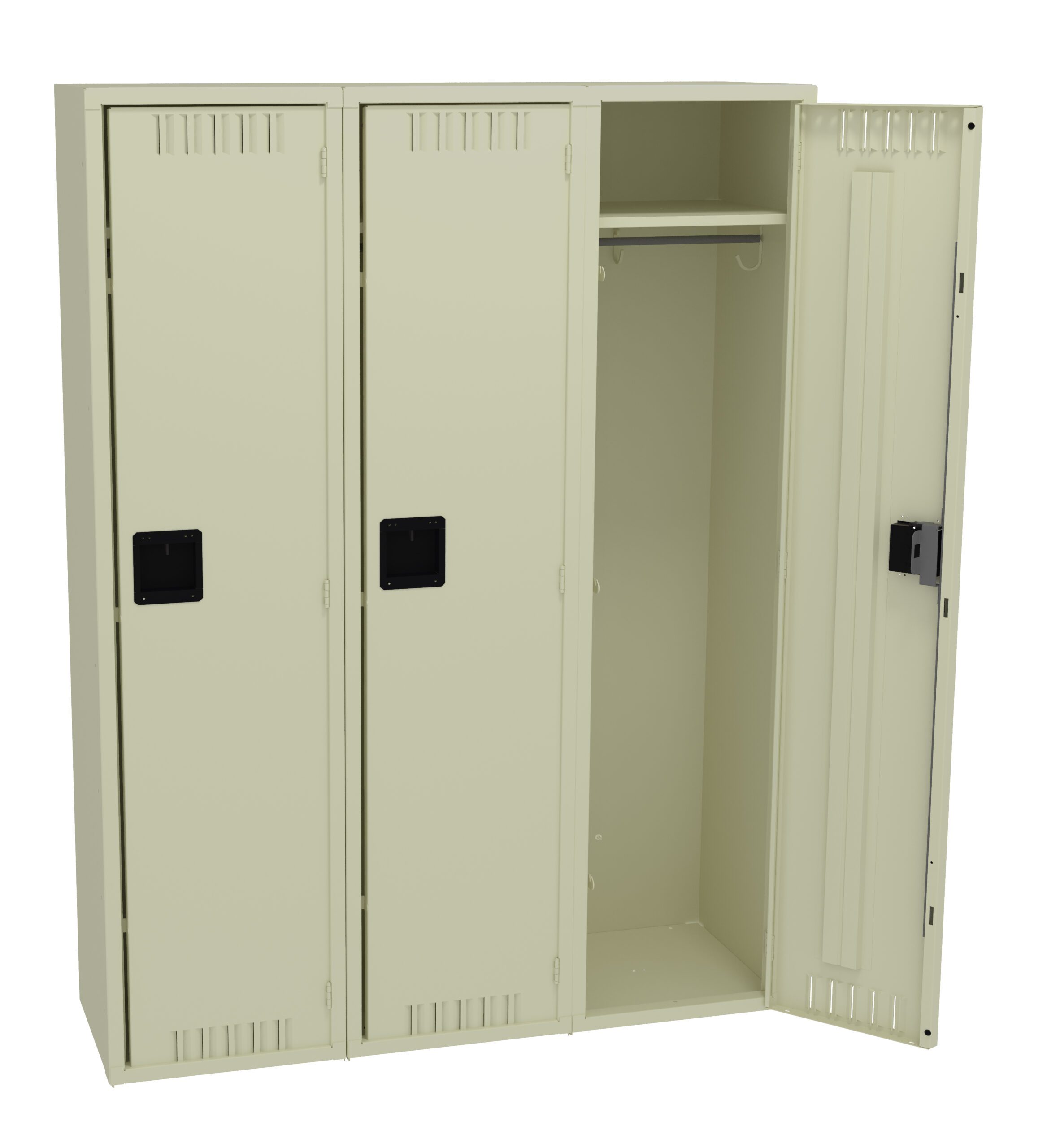 Single Tier Lockers are our most popular general purpose locker, ideal for factories, schools, hospitals. Three coat hooks per opening. Positive 3 point locking system on doors. Flush louvers for ventilation. Door stiffeners add rigidity.