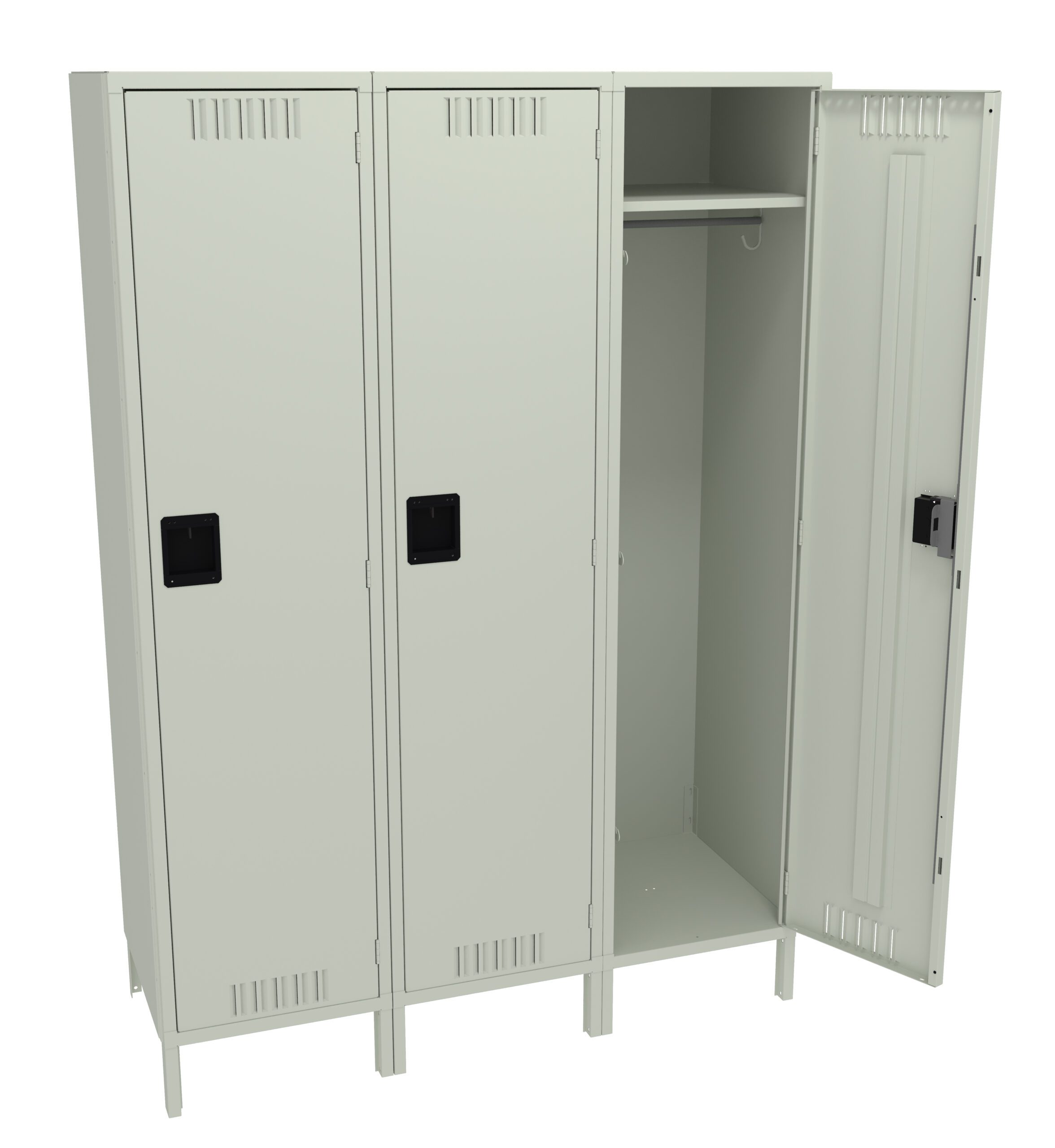 Single Tier Lockers are our most popular general purpose locker, ideal for factories, schools, hospitals. Three coat hooks per opening. Positive 3 point locking system on doors. Flush louvers for ventilation. Door stiffeners add rigidity.