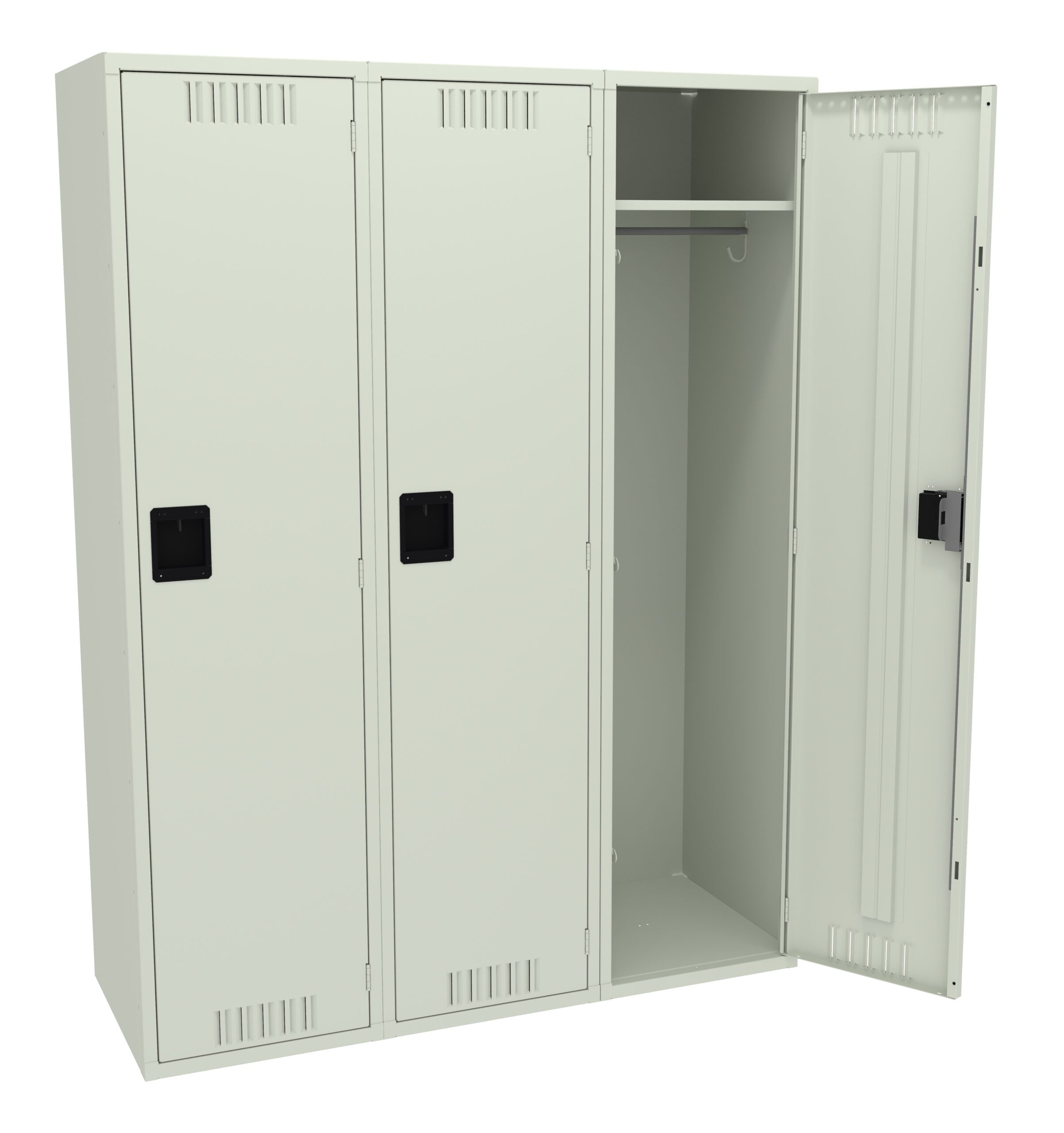 Single Tier Lockers are our most popular general purpose locker, ideal for factories, schools, hospitals. Three coat hooks per opening. Positive 3 point locking system on doors. Flush louvers for ventilation. Door stiffeners add rigidity.