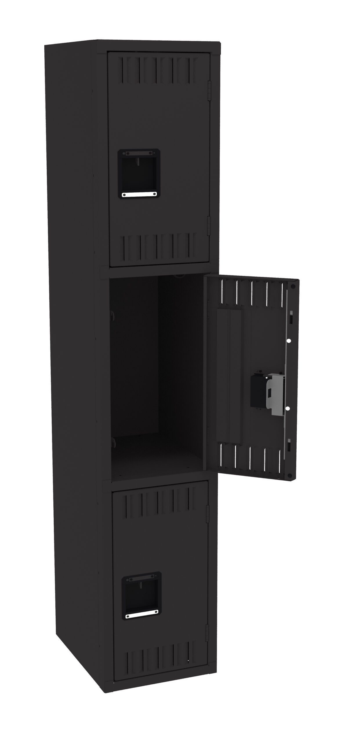 Triple Tier Lockers are ideal for health clubs, gymnasiums, and other applications where ample storage must be balanced with space savings. Three coat hooks per opening. Positive 2 point locking system on doors. Flush louvers for ventilation. Door stiffeners add rigidity.