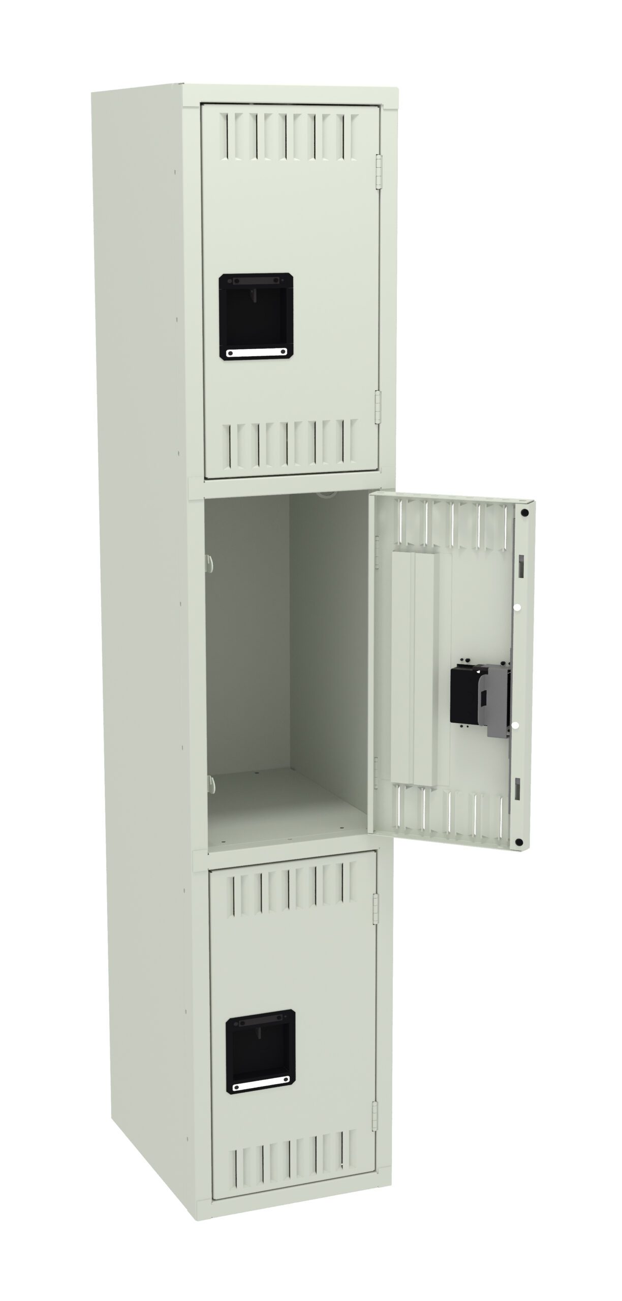 Triple Tier Lockers are ideal for health clubs, gymnasiums, and other applications where ample storage must be balanced with space savings. Three coat hooks per opening. Positive 2 point locking system on doors. Flush louvers for ventilation. Door stiffeners add rigidity.