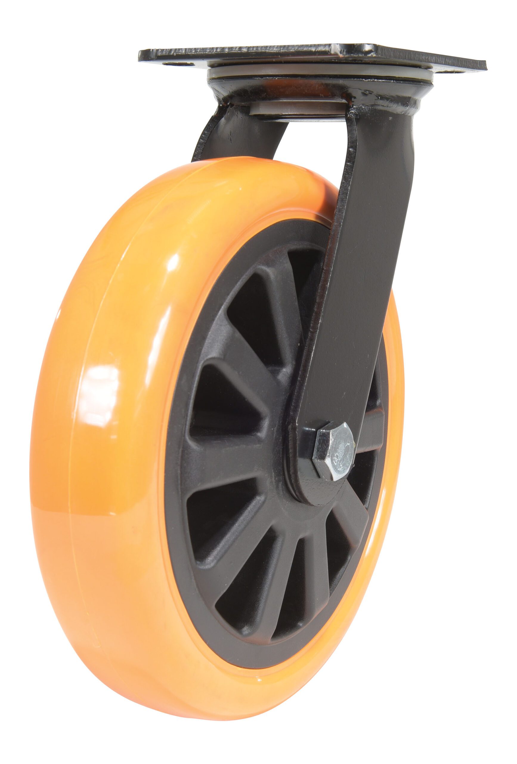 Polyurethane is ideal for most environments. It is resistant to a variety of chemicals, and produces an easy roll for ergonomic applications. It also provides good floor preservation and works effectively in both indoor and outdoor environments. The unique spoke design allows for a lighter weight caster with the same amount of capacity.