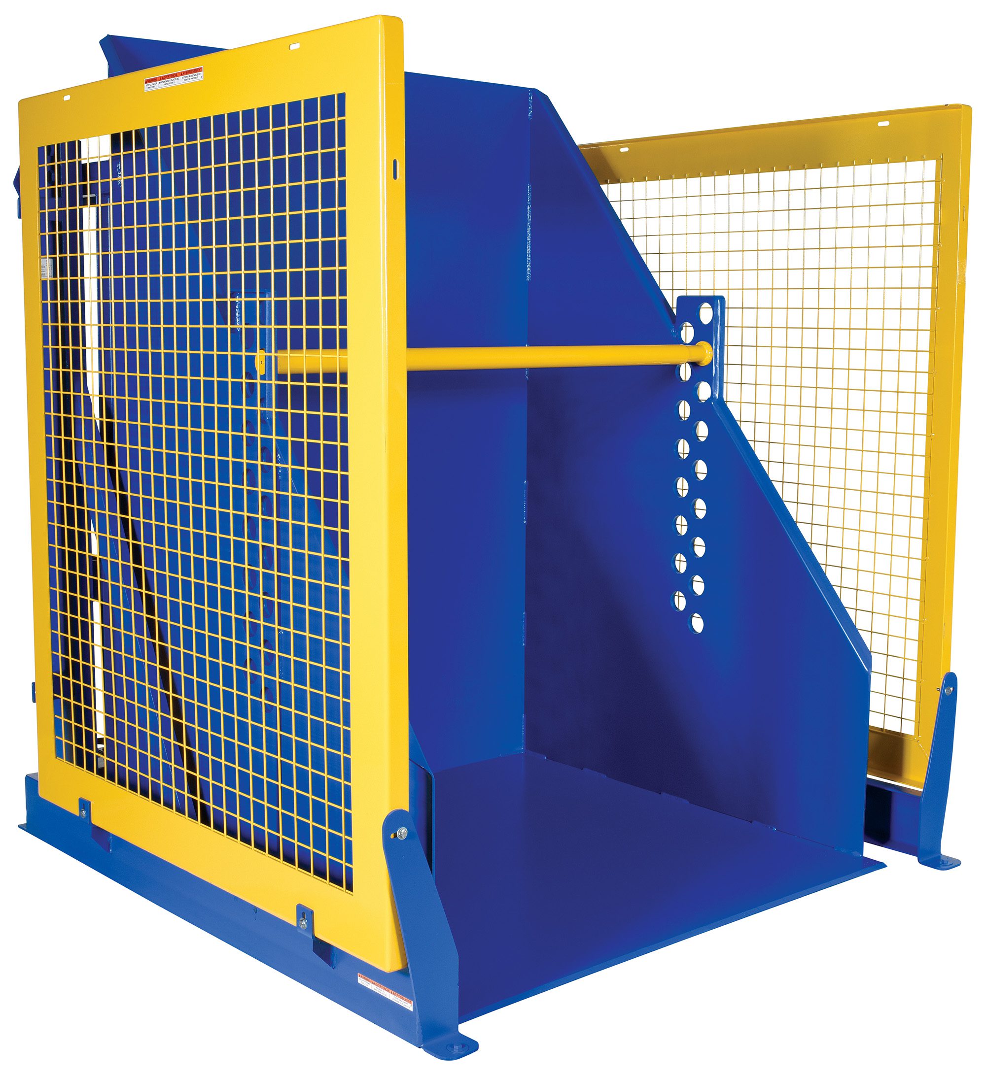 The Electric/Hydraulic Box Dumper is designed for controlled dumping of material from boxes, crates, and other types of containers. It is designed for pallet truck loading and unloading. The retaining bar adjusts to accommodate a wide range of container heights. Each dump height has a hold down range and an internal power unit with a hand held control standard. It has a heavy-duty welded steel construction with protective mesh side screens included.