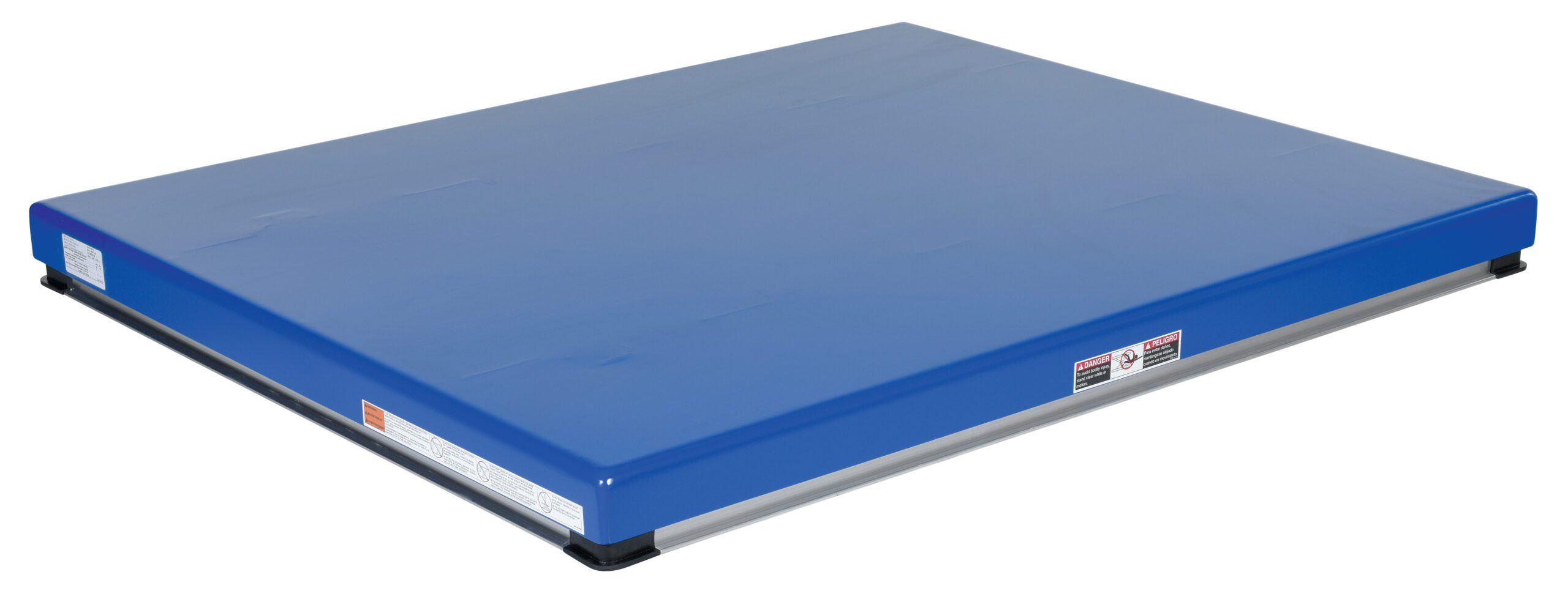 The Electric Hydraulic Scissor Lift Table is used by all types of manufacturing and warehouse facilities. Safety features include: patented pinch point perimeter toe guard to protect pinch points while lowering of the table, fused push button control, internal safety velocity fuse to maintain platform height in an event of hose or fitting failure, integral maintenance prop, adjustable upper travel limit switch to stop table at maximum height, and a displacement-style hydraulic cylinders for maximum strength. It also features a pressure plated pump, manifold system, displacement style hydraulic cylinder, and a state-of-the-art lifetime lubricated bearings. The standard 56 frame electric motor is a fully enclosed with optional voltages available. Contact factory if platform dimensions are crucial.