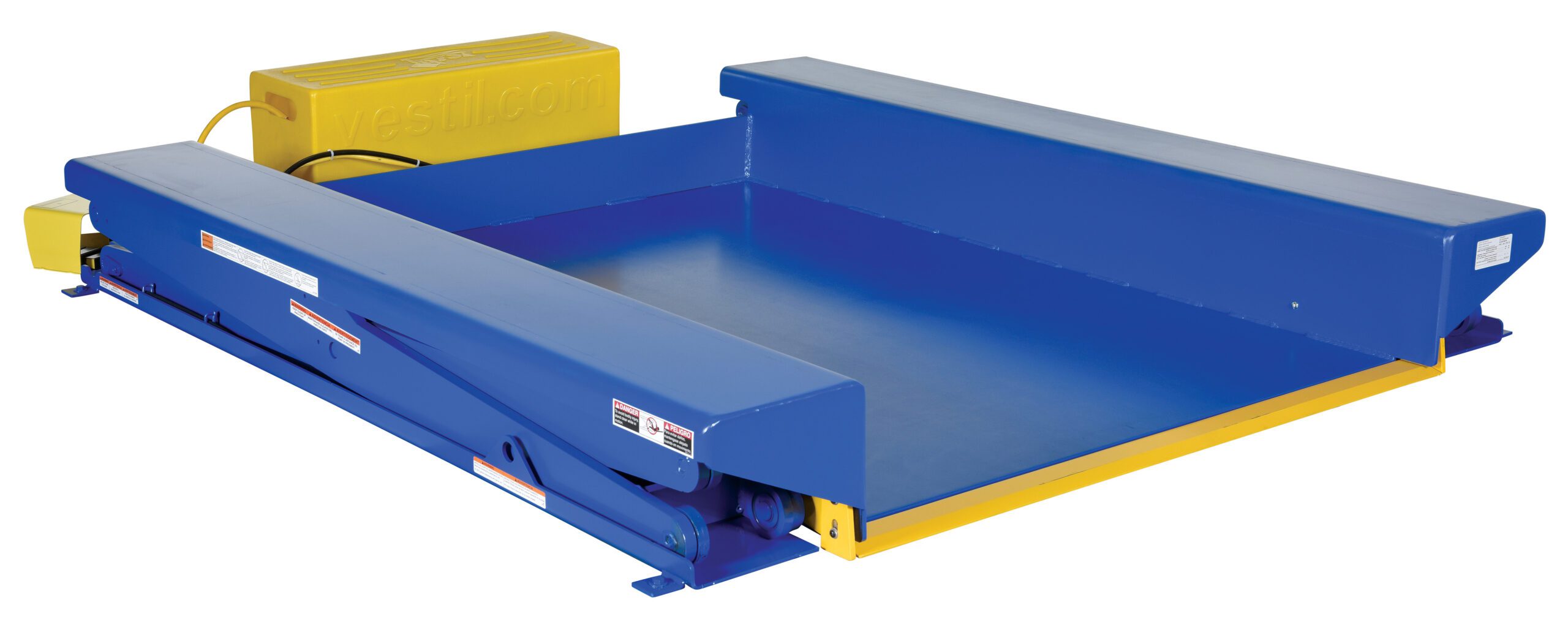 The Ground Lift Scissor Table is designed for use when fork trucks are not available. The pallets can be loaded onto the platform with pallet trucks and raised to an ergonomic working height. The safety features include: entry-side electric toe guard to protect pinch points during lowering of the table, velocity fuse to maintain platform height in the event of a hose or fitting failure, foot control, maintenance prop, and upper travel limit switch to stop table at maximum height reducing motor wear. The motor is totally enclosed standard with optional voltages available. The remote power unit can be located up to eight (8) feet away from the table. Optional accordion skirting is available.