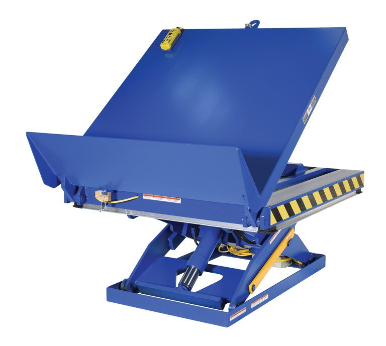 The Lift & Tilt Scissor Lift performs both lifting and tilting operations. There is a restraining chain and lip to keep the load in place during tilting. Safety features include: electric toe guard to protect worker from pinch points during lowering of table, velocity fuses to hold platform position in an event of a hose or fitting failure, four (4) push-button hand pendant control, upper limit switch to stop travel at maximum height reducing motor wear, and maintenance prop. The end tilt is standard with a side tilt available. There is optional accordion skirting available for both the lifting and tilting portions of the table.
