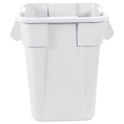 The Rubbermaid Brute Square Trash Can - 40 Gallon, White - 1 EACH has a plain, rectangular shape with a tapered design, wide rim, and dual side handles. Its smooth white surface offers a sleek touch to any space.