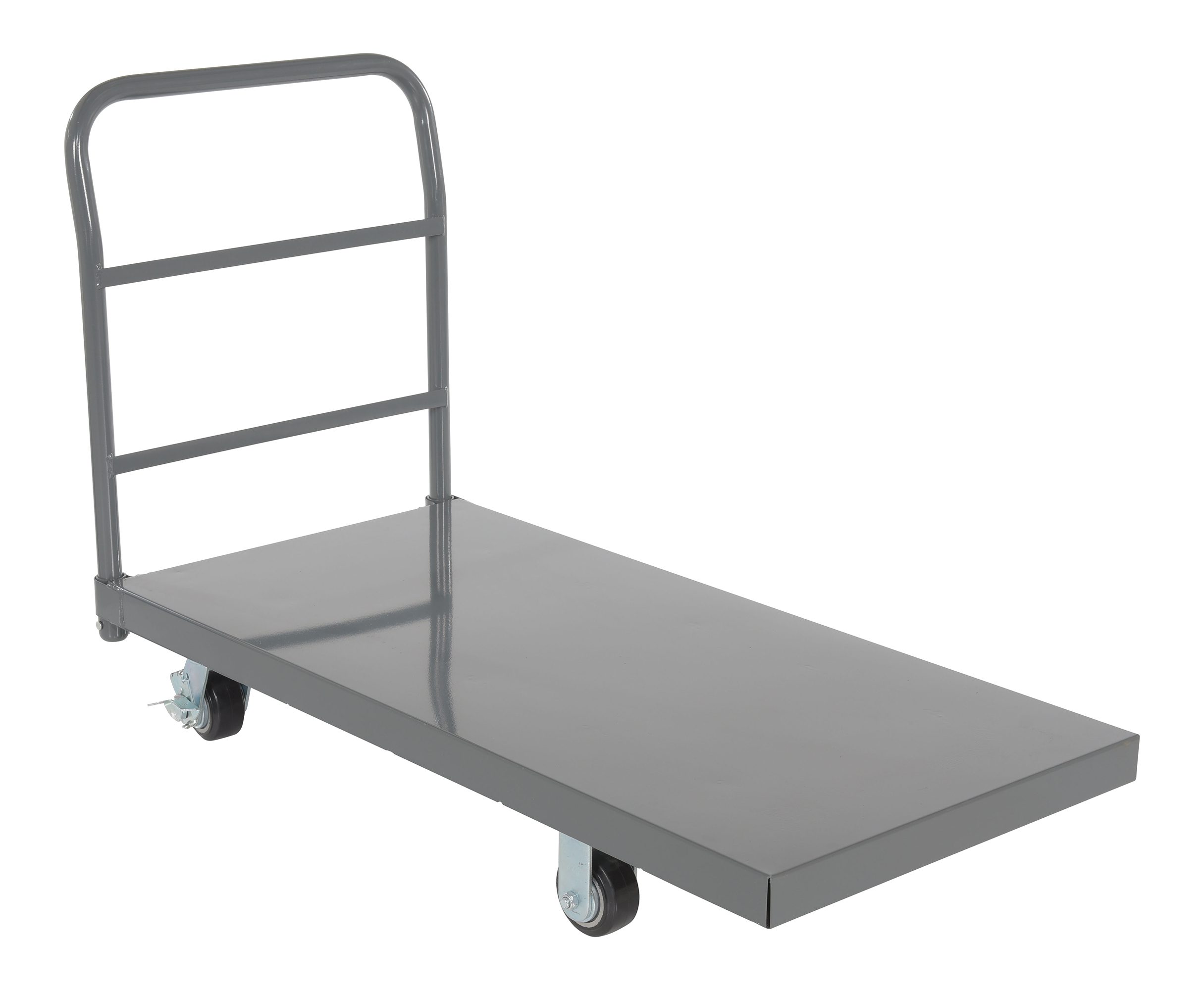 Steel Platform Truck with solid, smooth steel deck is all welded and features structural reinforcement underneath for extra strength. Includes one (1) removable high-polished steel handle and rolls smoothly casters. Comes standard with a floor lock.