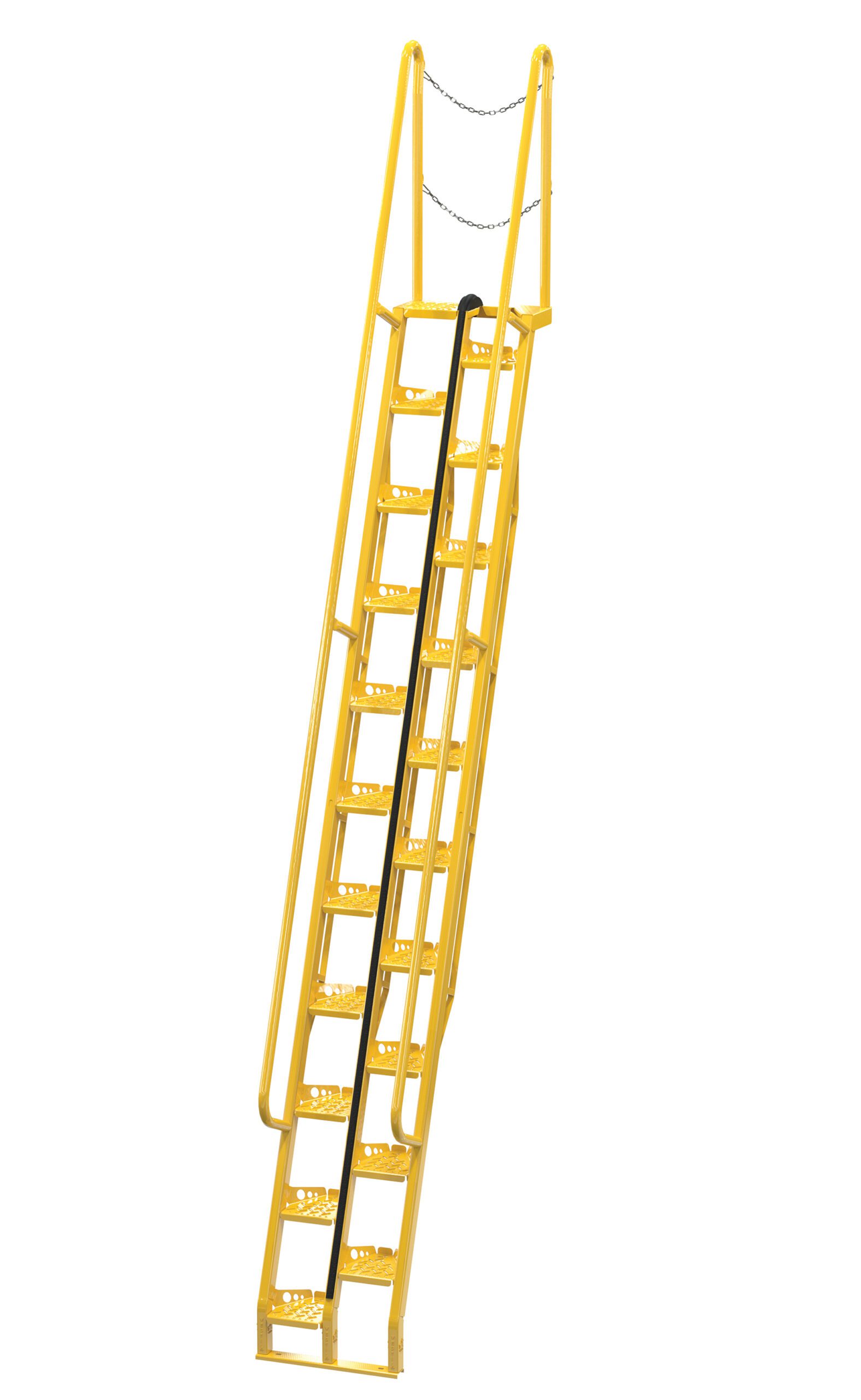 Alternating-Tread Stair design offers a shorter span than traditional steps. Features handrail on each side of unit, dual safety chain at the top of the stair and formed steel steps with raised surfaces for better traction. Welded steel construction with bolt-on handrails.