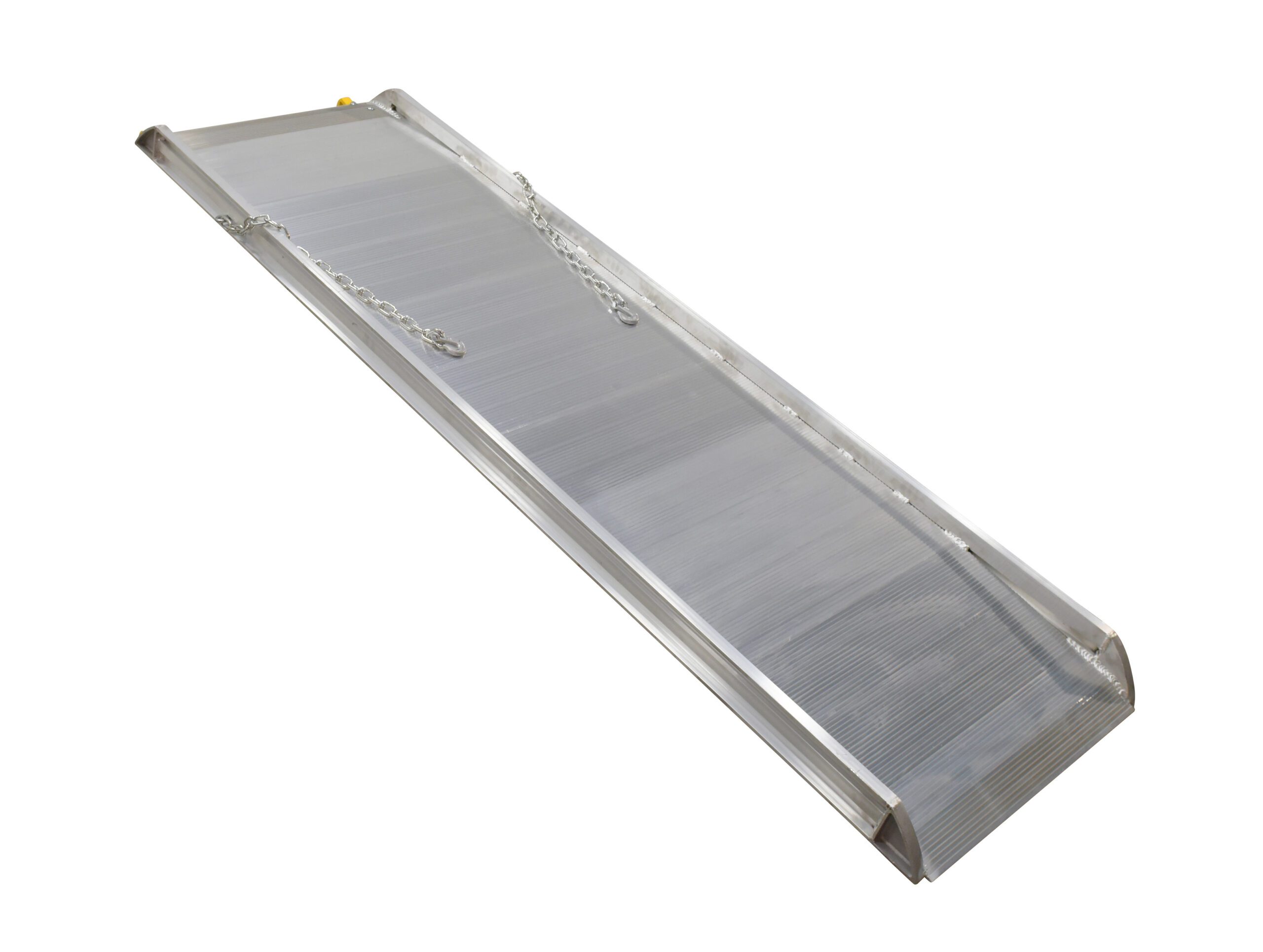 The Aluminum Walk Ramp enables delivery men/women, shippers, and receivers to load and unload trucks when docks are unavailable. Heavy-duty steel chains with steel grab hooks are attaches to each side of ramp for safely securing ramp to truck. Constructed of strong aluminum alloy with non-skid tread surface. The ramp is lightweight and easy to handle. This steel hook style mounts onto the truck extensions.