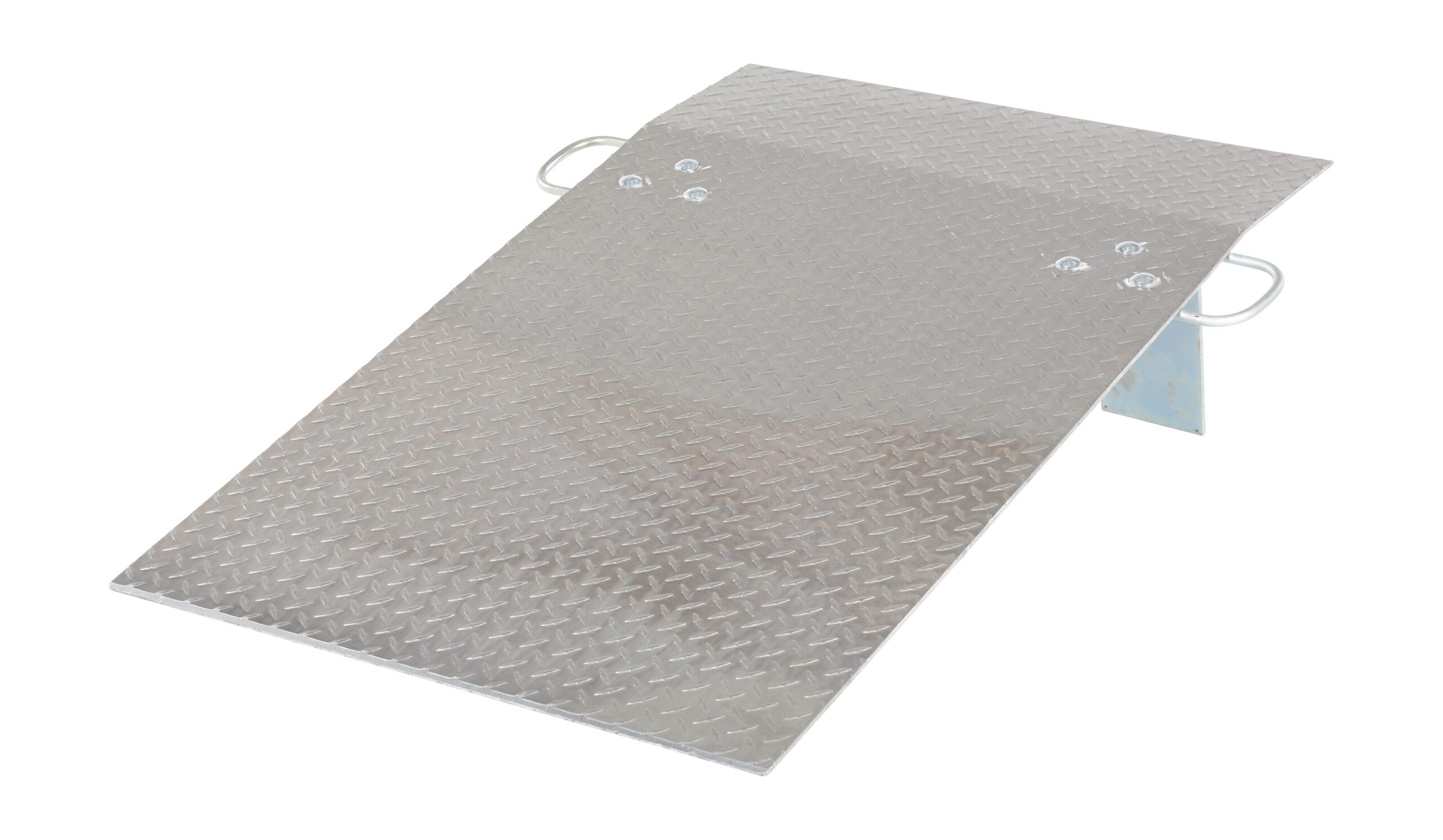 This Aluminum Hand Truck Dockplate is designed for use with two (2) wheel hand trucks. It is a convenient, safe, and easy way to access loading docks from trucks. This dockplate is lightweight and easily transported by just one person. The tread plate surface ensures skid-resistant safe traction and the locking legs secure the plate for safe loading and unloading. Complete with bolt-on zinc plated carrying handles and locking legs.