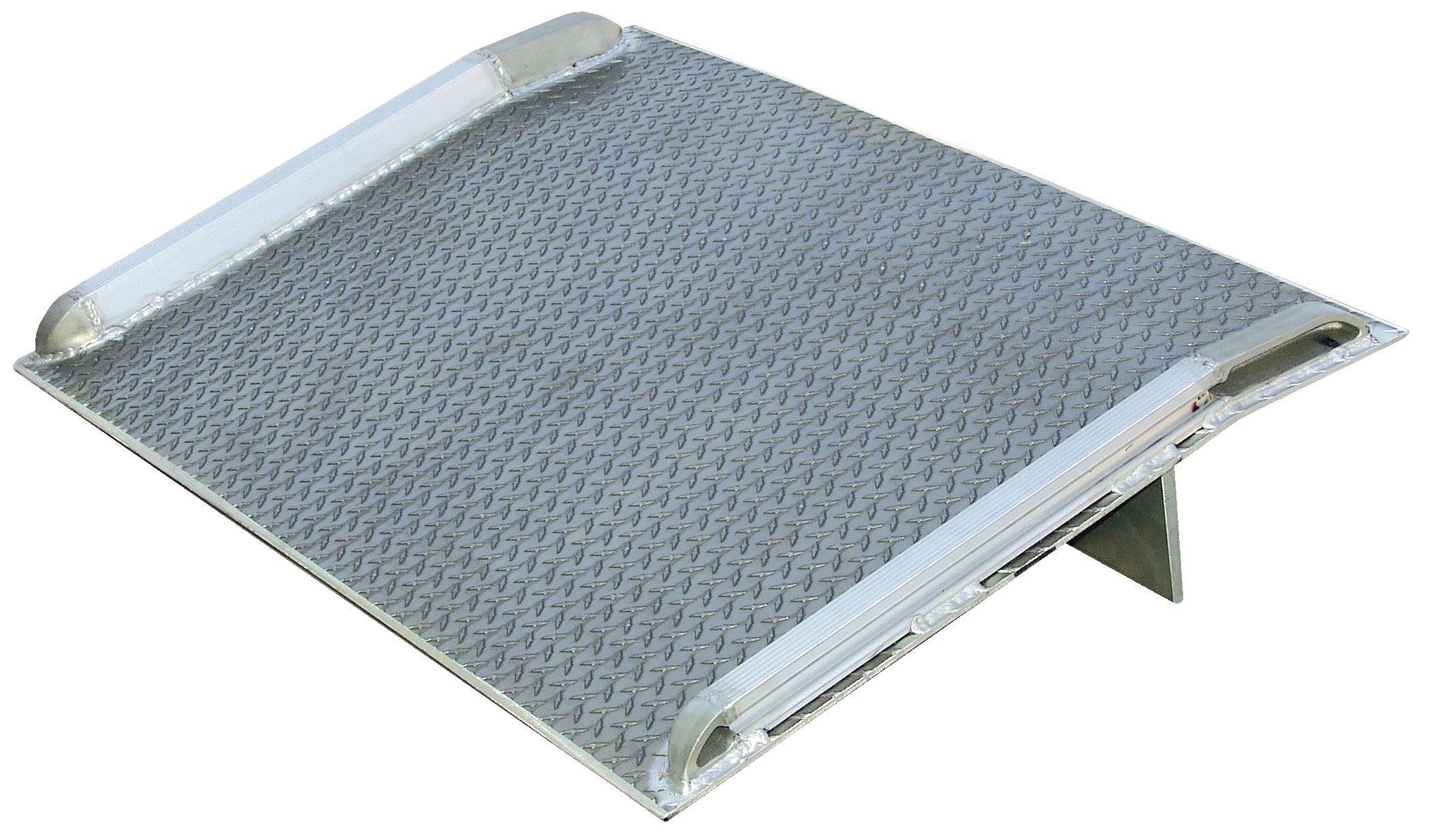 The Aluminum Truck Dockboard is engineered and built to maximize safety while handling heavy fork trucks and loads. The beveled edge is designed for smooth entry and exit. Locking legs prevent movement during loading and unloading operations. Locking legs are uneven to allow the dockboard to sit canted, while not in use, for easier pickup by fork trucks. Welded aluminum safety curbs prevent accidental runoffs and provide visible driving lane. When using three-wheeled fork trucks order dockboard with capacity at least four-times the lifting capacity of fork truck. The width of the dockboard should be at least 15 (in.) wider than the load or equipment passing between the curbs. Bend is 11° and 9″ from the edge and the legs are 12″ from the edge. Manufactured in compliance with OSHA.
