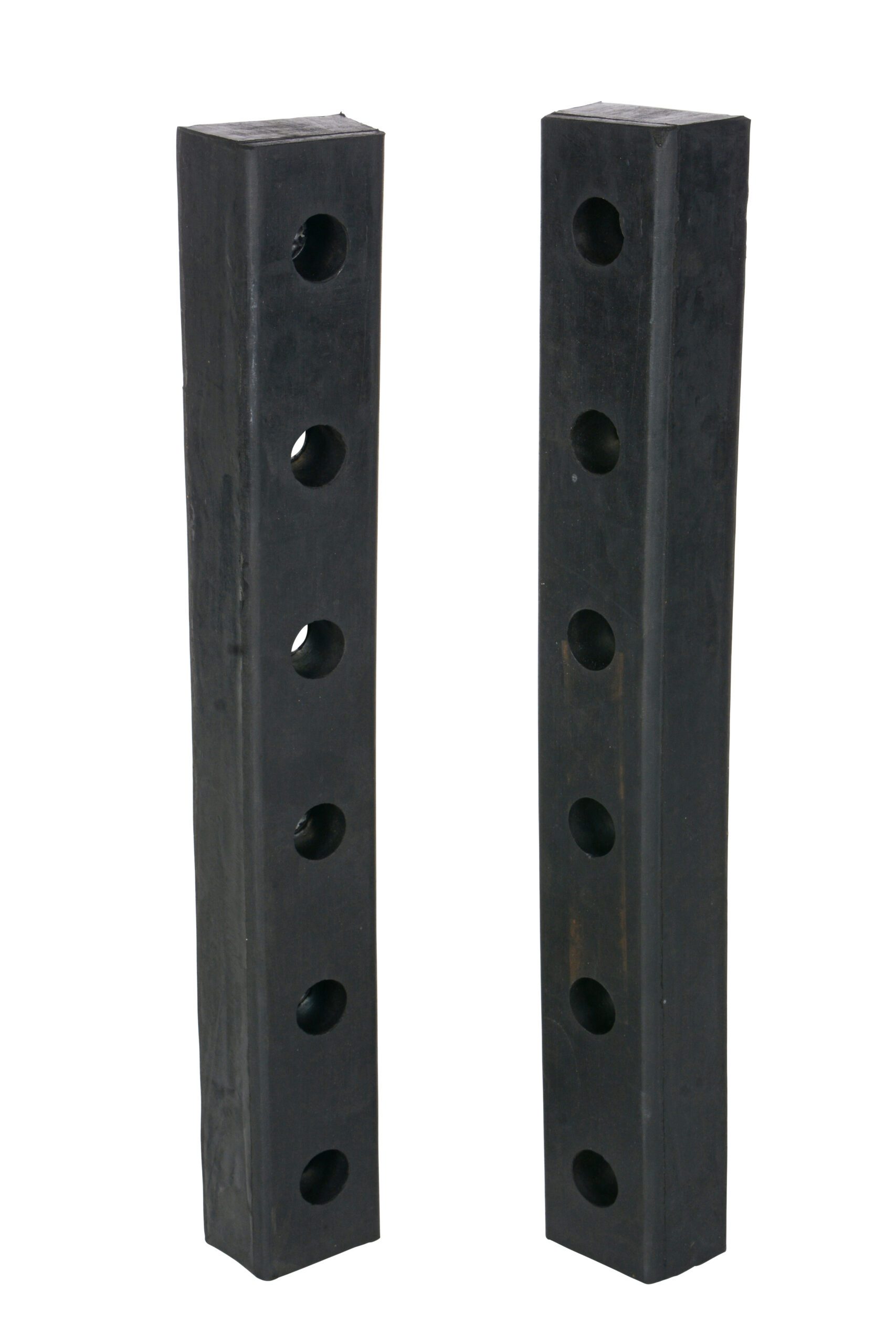 Two vertical black rectangular blocks, each 30 inches tall with circular holes, resemble the Vestil Hardened Molded Rubber Bumper Two 30 In as they stand upright against a plain white background.