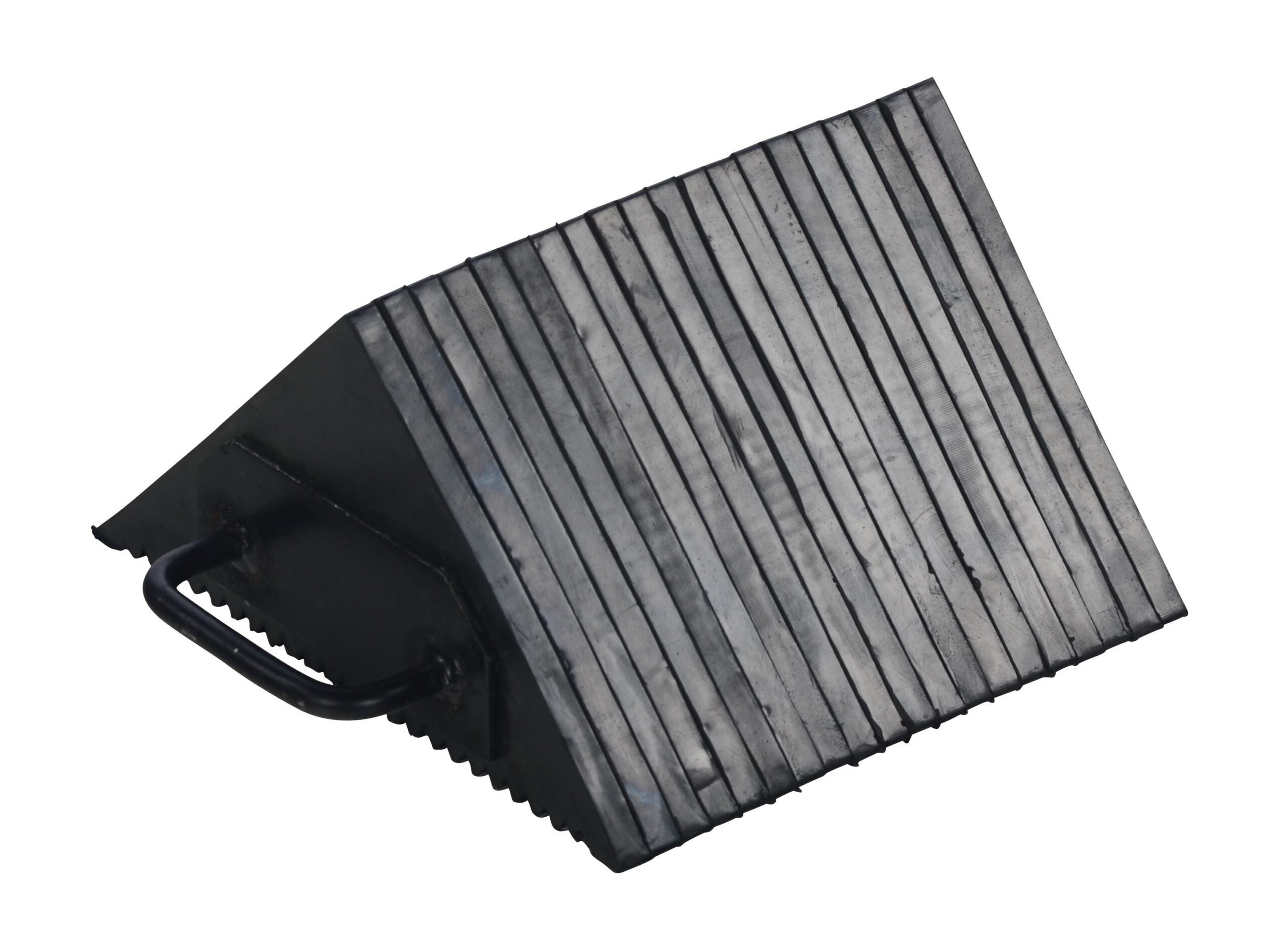 The Rubber Wheel Chock is constructed of reinforced rubber to provide a sure grip on virtually any surface. The curved surface contours to fit tires. Rubber resists tearing, abrasion, ozone weathering, etc. The functional design is durable in all weather conditions.