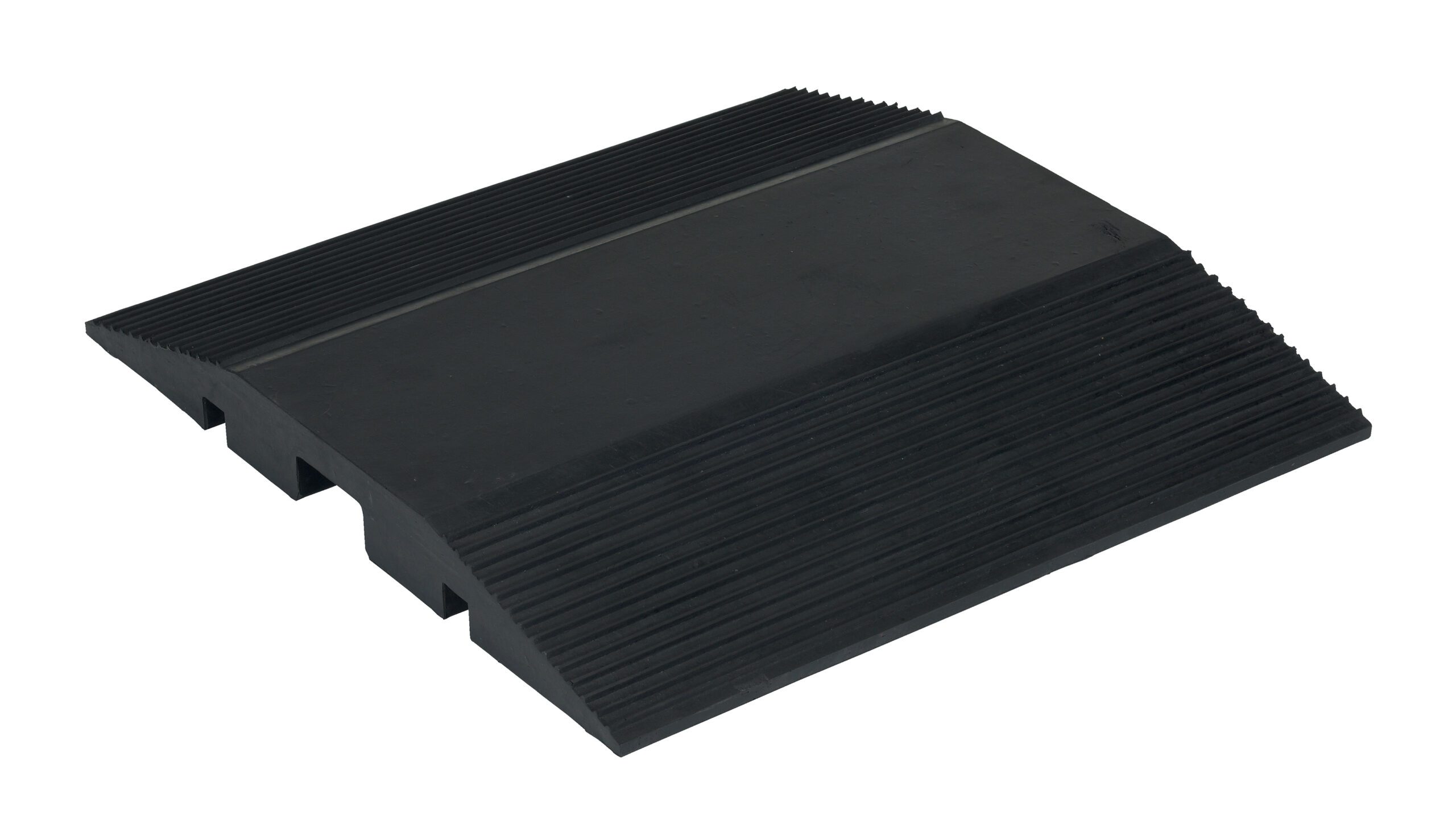 The Molded Rubber Hose and Cable Crossover is designed to protect cables and hoses from pedestrian and rolling traffic. The top surface of each crossover includes serrations for extra traction. Carrying handles molded into the ramp. Fits over cables to protect hoses from punctures and kinks. Optional connectors may be used to interlock individual units together to form wider crossovers. Simply lock together as many units as required.