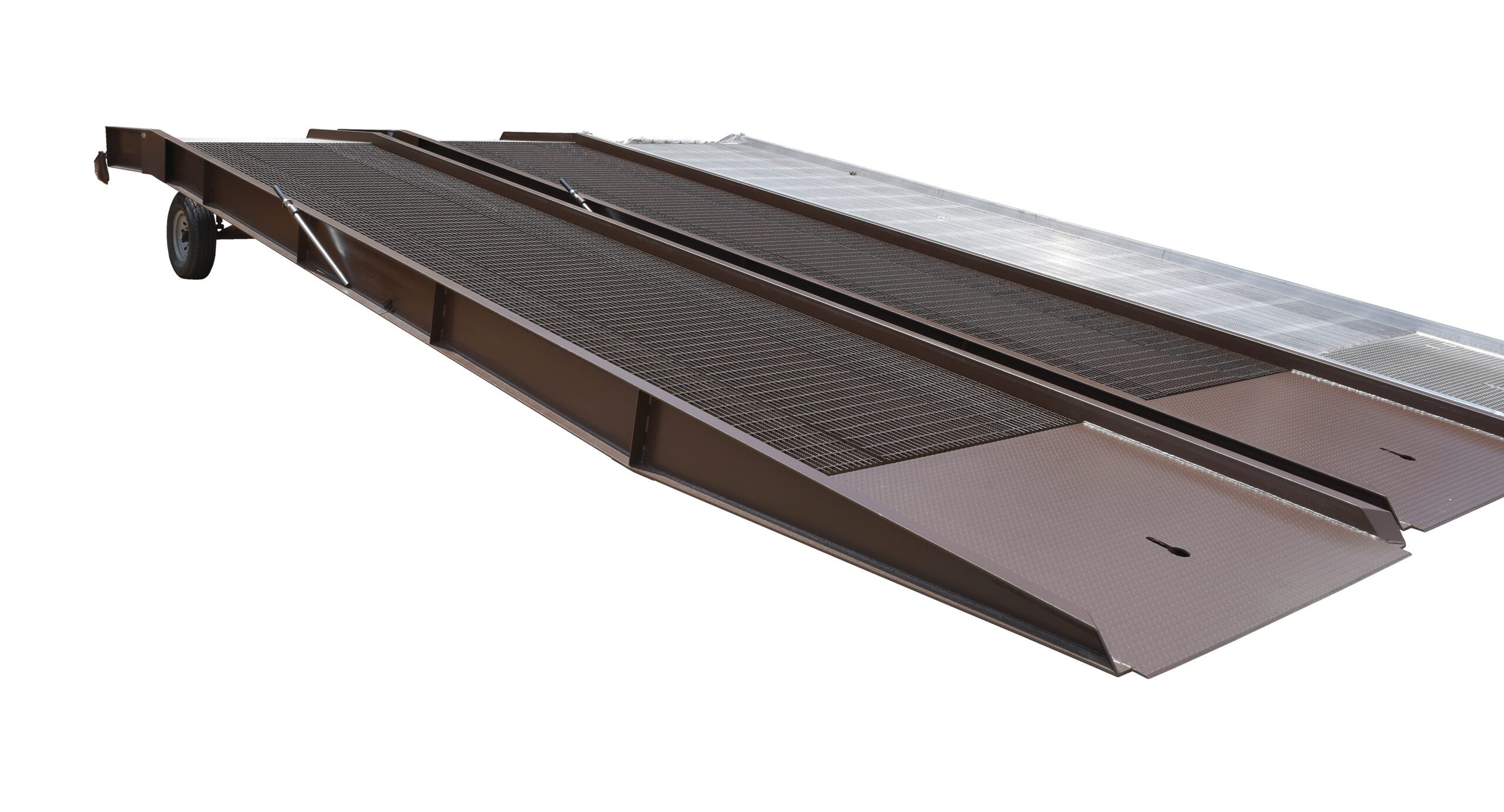 The Portable Steel Yard Ramp quickly loads and unload trucks, trailers and rail cars from ground level when no freight dock exists. Increase productivity while reducing material handling costs. Great for construction sites. A manual two-speed hand crank for easy one (1) person height adjustment. The standard features include: positive traction open steel grating, safety locking chains, rubber bumpers and fork positioning loop. Painted neutral earth-tone brown. Includes landing gear and crank mechanism.