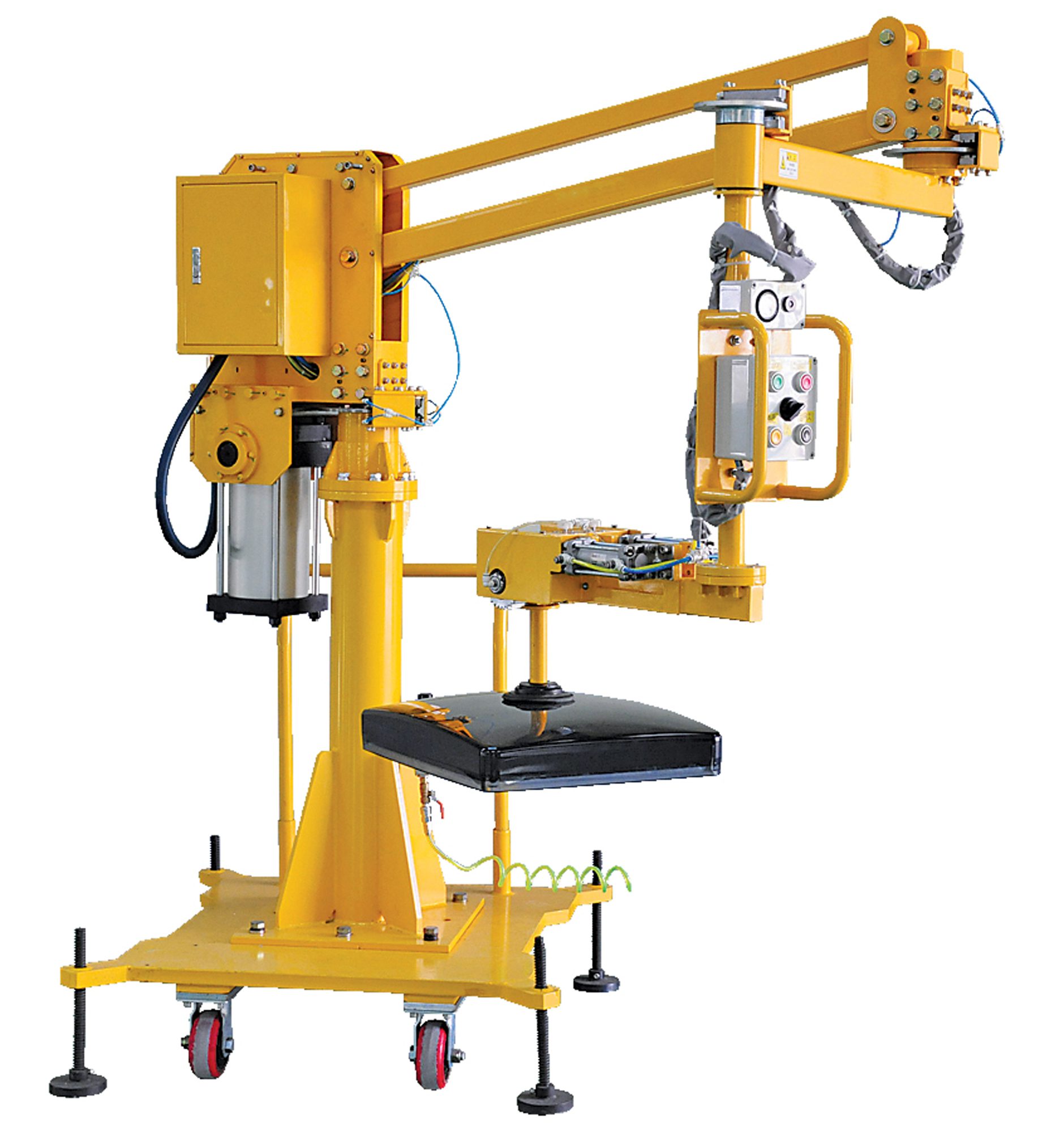 The Air Balancer Jib Lifter achieves high performance, excellent safety, and low cost in the handling of heavy materials. Designed to effortlessly handle materials in a three dimensional work space. The push-button hand control operates the pneumatic cylinder, raising and lowering the cable, in turn, positioning the load. This is a portable unit.