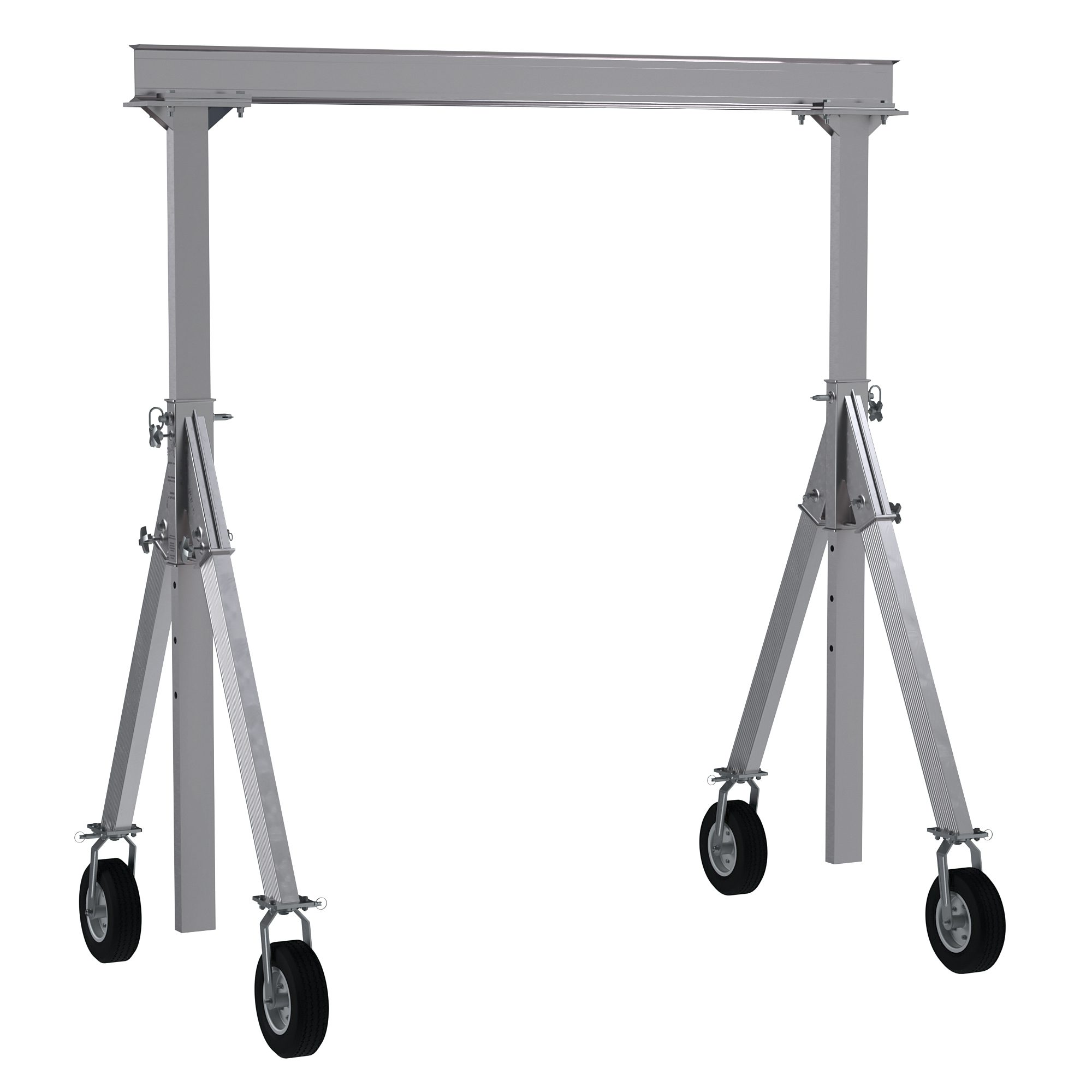 The Adjustable Height Aluminum Gantry Crane combines lightweight and rigid, sturdy construction into one unit. The all aluminum construction of this gantry crane makes it corrosion resistant and perfect for outdoor use. The lightweight I-Beam allows height adjustment without the need of a hoist or fork truck. All pined connections make it possible for single person set up and take down in just minutes. Included are two (2) straps, allowing one person to transport the gantry crane in one neat package. Four-way locking pneumatic casters included.