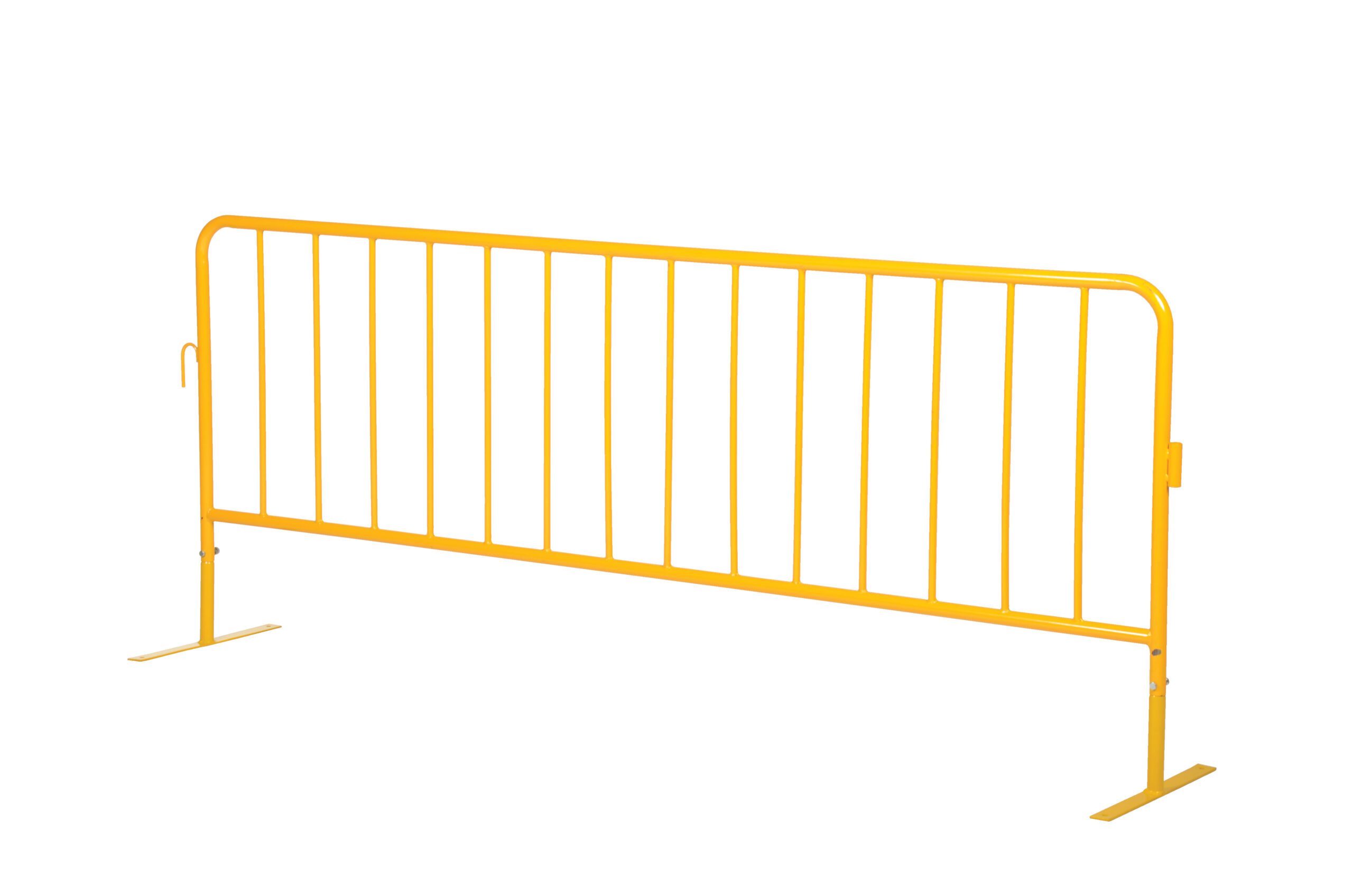 The Vestil Yellow Barrier W/Flat Feet is ideal for crowd control, featuring vertical bars and sturdy flat feet. A hook allows easy chaining of units. Its plain white background makes it functional and unobtrusive.
