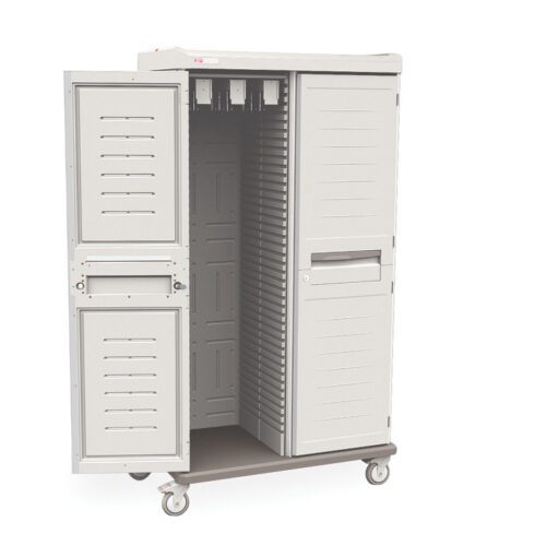- Components: Double-wide mobile shell, 2 catheter shelves, 6 catheter slides with 60 labels, 30 catheter hooks, left-hinged and right-hinged 270-degree tall solid doors with M300 series keylocks and 2 keys each, and taupe door pulls.