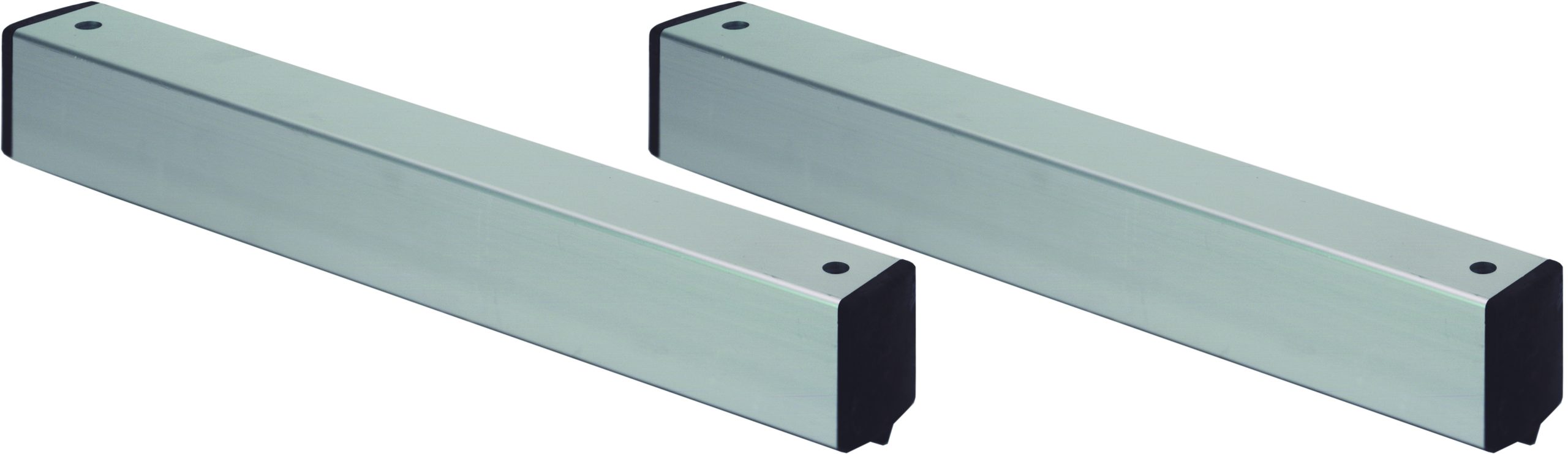 Two NSF-approved aluminum beams named Quantum Two Skates for Floor Track Systems feature a smooth, reflective silver surface with black end caps, positioned parallel on a white background, seamlessly integrating into modern setups.