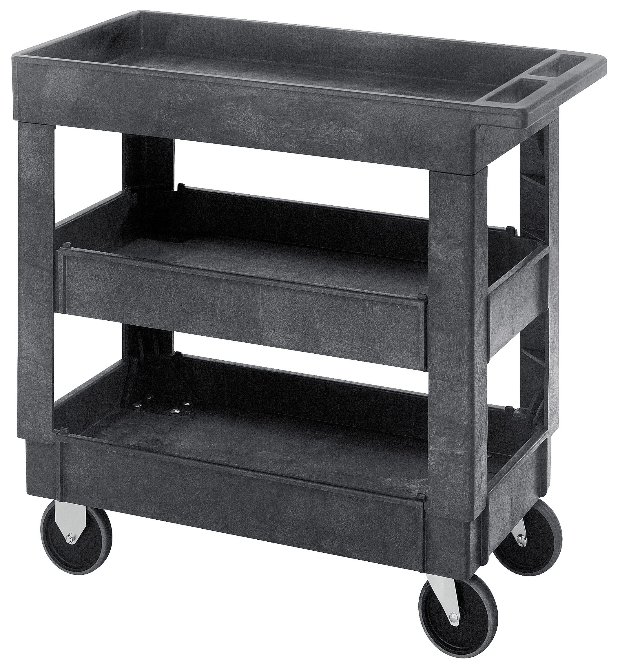 Quantum Utility Cart, (3) Shelves, 550 Lb. Capacity, Push Handle, (4) 5″ Casters: (2) Rigid And (2) Swivel, Polymer, Gray, Shipped Kd – QM-PC3518-33-3