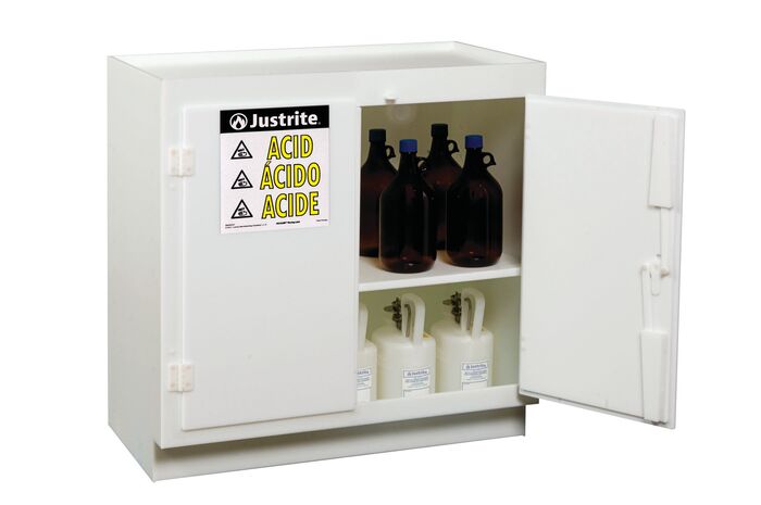 Freestanding corrosives/acid safety cabinet, Cap. thirty-six 2-1/2 ltr bottles, 2 door, poly, White.
