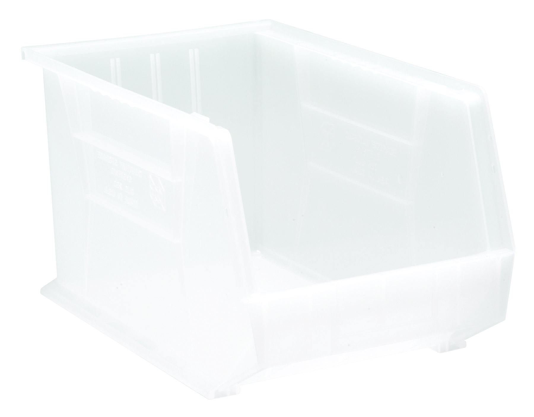 Quantum Bin, Stacking Or Hanging, 11″W X 18″D X 10″H, Front/Back/Side Grips, Anti-Slide Lock, (3) Divider Slots, Rear Hanger, Molded-In Label Holder, Polypropylene, Clear, Made In USA
