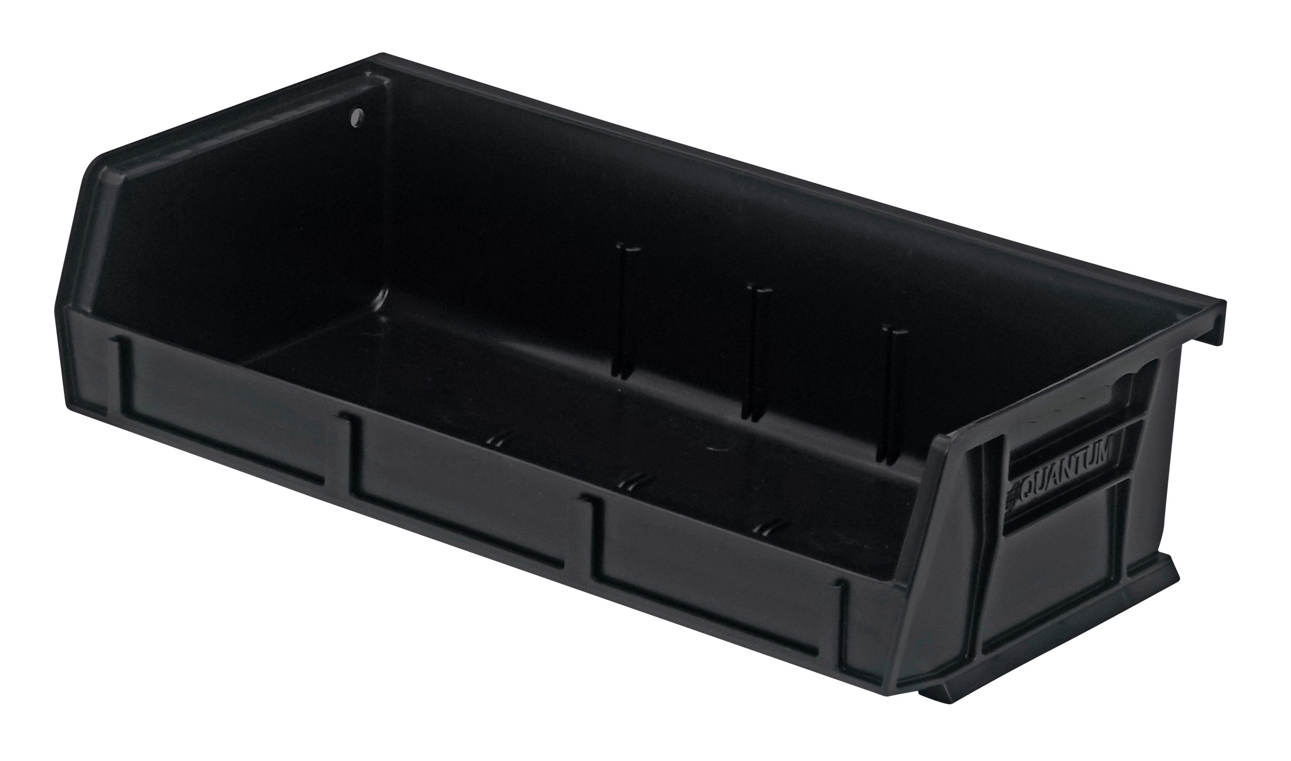 Quantum Bin, Stacking Or Hanging, 11″W X 5-3/8″D X 3″H, Front/Back/Side Grips, Anti-Slide Lock, (3) Divider Slot, Rear Hanger, Molded-In Label Holder, Polypropylene, Black, Made In USA