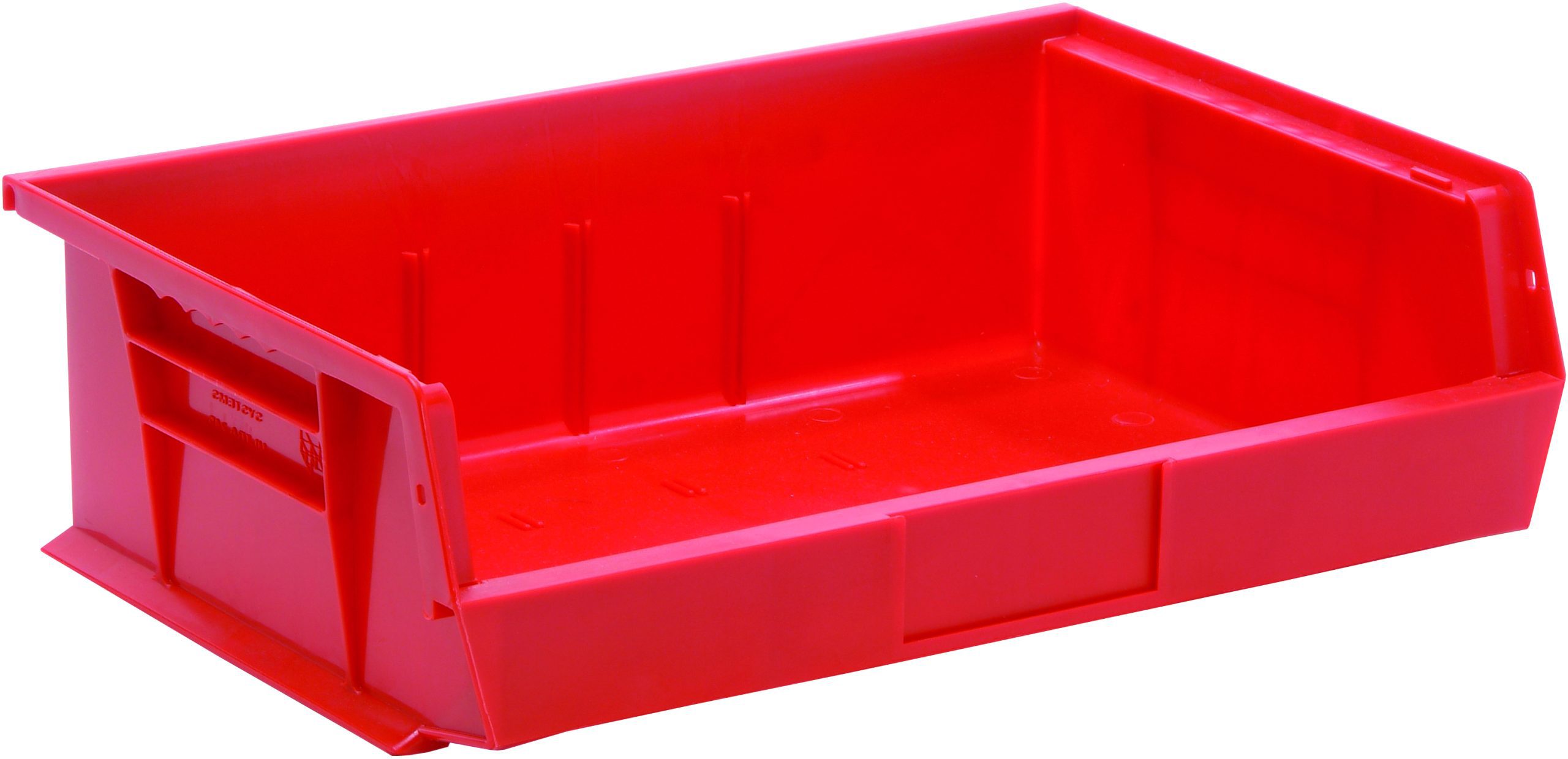Quantum Bin, Stacking Or Hanging, 16-1/2″W X 10-7/8″D X 5″H, Front/Back/Side Grips, Anti-Slide Lock, (3) Divider Slot, Rear Hanger, Molded-In Label Holder, Polypropylene, Red, Made In USA