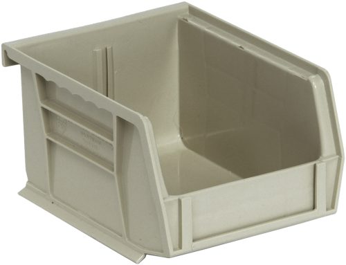 Quantum Bin, Stacking Or Hanging, 4-1/8″W X 5-3/8″D X 3″H, Front/Back/Side Grips, Anti-Slide Lock, (1) Divider Slot, Rear Hanger, Molded-In Label Holder, Polypropylene, Stone, Made In USA