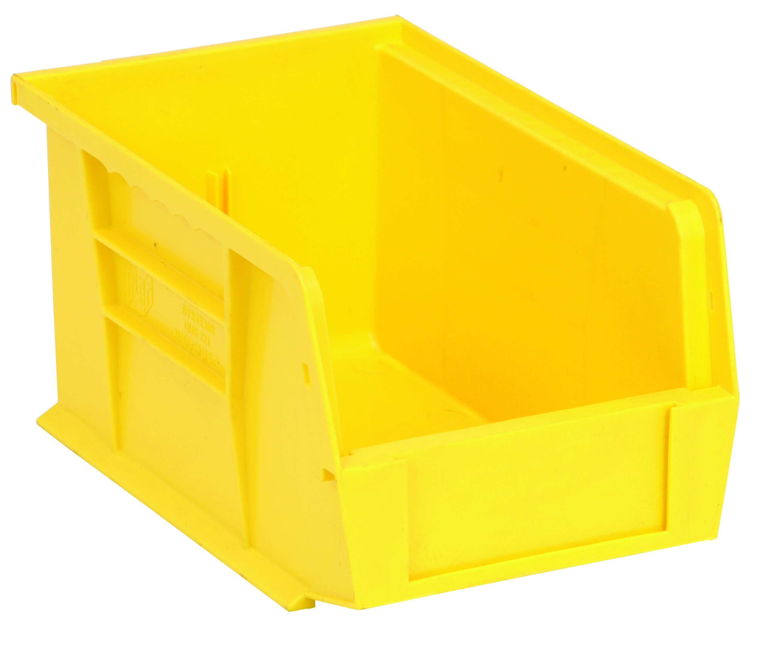 Quantum Bin, Stacking Or Hanging, 6″W X 9-1/4″D X 5″H, Front/Back/Side Grips, Anti-Slide Lock, (1) Divider Slot, Rear Hanger, Molded-In Label Holder, Polypropylene, Yellow, Made In USA