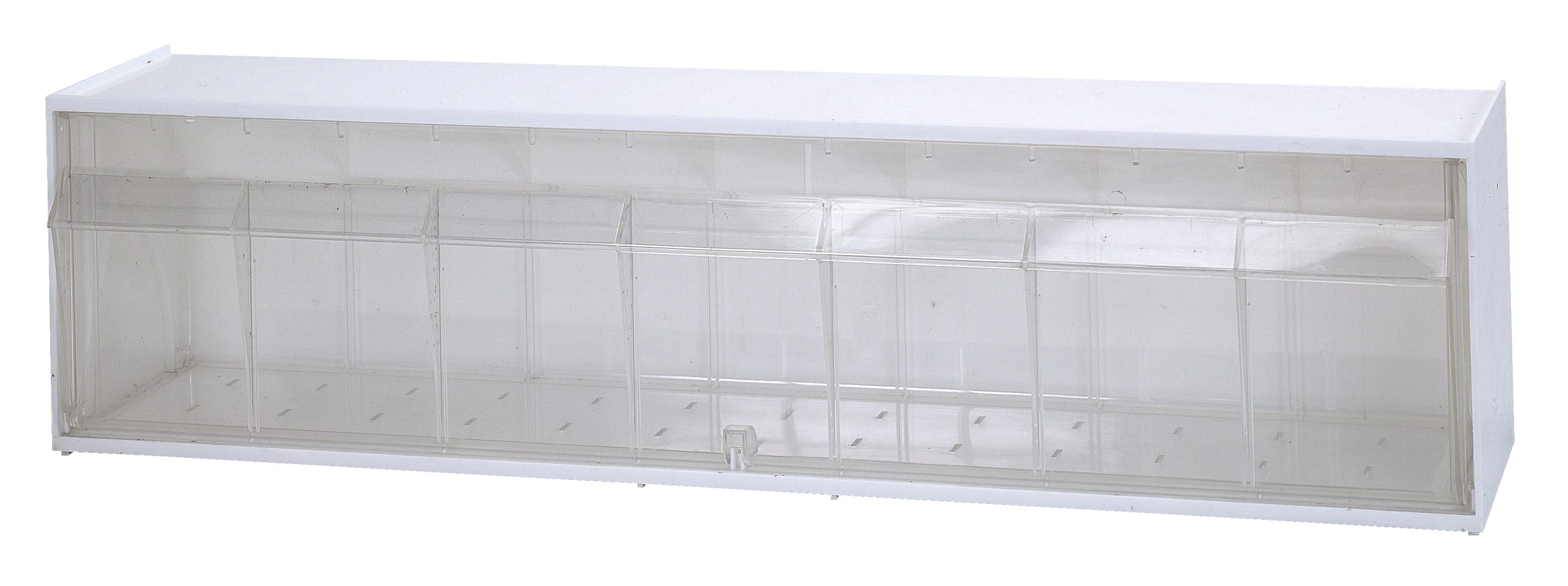 -58%Dividable Tip Out Bin, (1) compartment, 23-5/8″W x 5-1/4″D x 5-15/16″H, handle with label slot, opens to a 45° angle, plastic clear container, polystyrene white cabinet, Made in USA