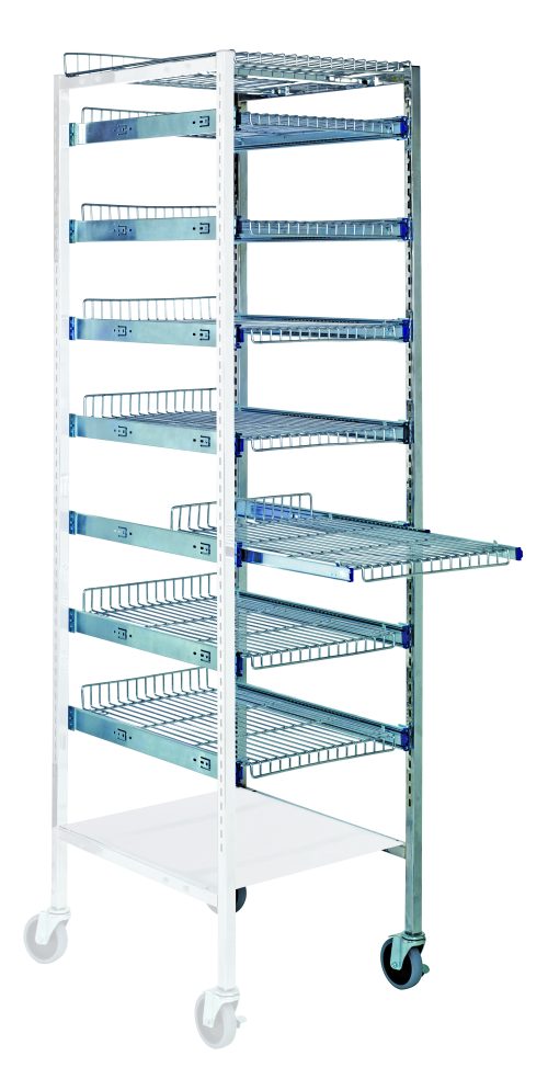 Partition Store Pull Out Basket Cart Add-On Unit with wire shelves, includes (1) frame, (4) cross bars, full extension slides, bottom dust cover and (2) 4″ casters, (1) with brake, chrome plated finish