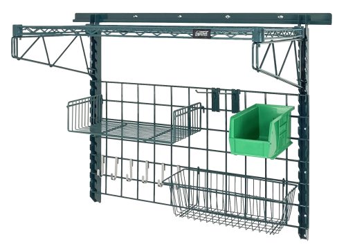 -58%Store Grid Medium-Duty Kit, includes: (1) 40″ wall track, (2) 31″ upright, (2) 18″ single cantilever arm, (1) 1836P, (1) 18″ x 36″ grid panel, (1) 17″L x 7″W x 5″H basket, (1) 9″W x 18″L small shelf, (2) 6″ hook, (6) small hook, (1) single bin holder and (1) QUS230 bin (available in blue, green, ivory, red, yellow and green), green epoxy antimicrobial finish, NSF