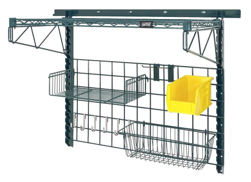 Store Grid Medium-Duty Kit, includes: (1) 40″ wall track, (2) 31″ upright, (2) 18″ single cantilever arm, (1) 1836P, (1) 18″ x 36″ grid panel, (1) 17″L x 7″W x 5″H basket, (1) 9″W x 18″L small shelf, (2) 6″ hook, (6) small hook, (1) single bin holder and (1) QUS230 bin (available in blue, green, ivory, red, yellow and green), green epoxy antimicrobial finish, NSF