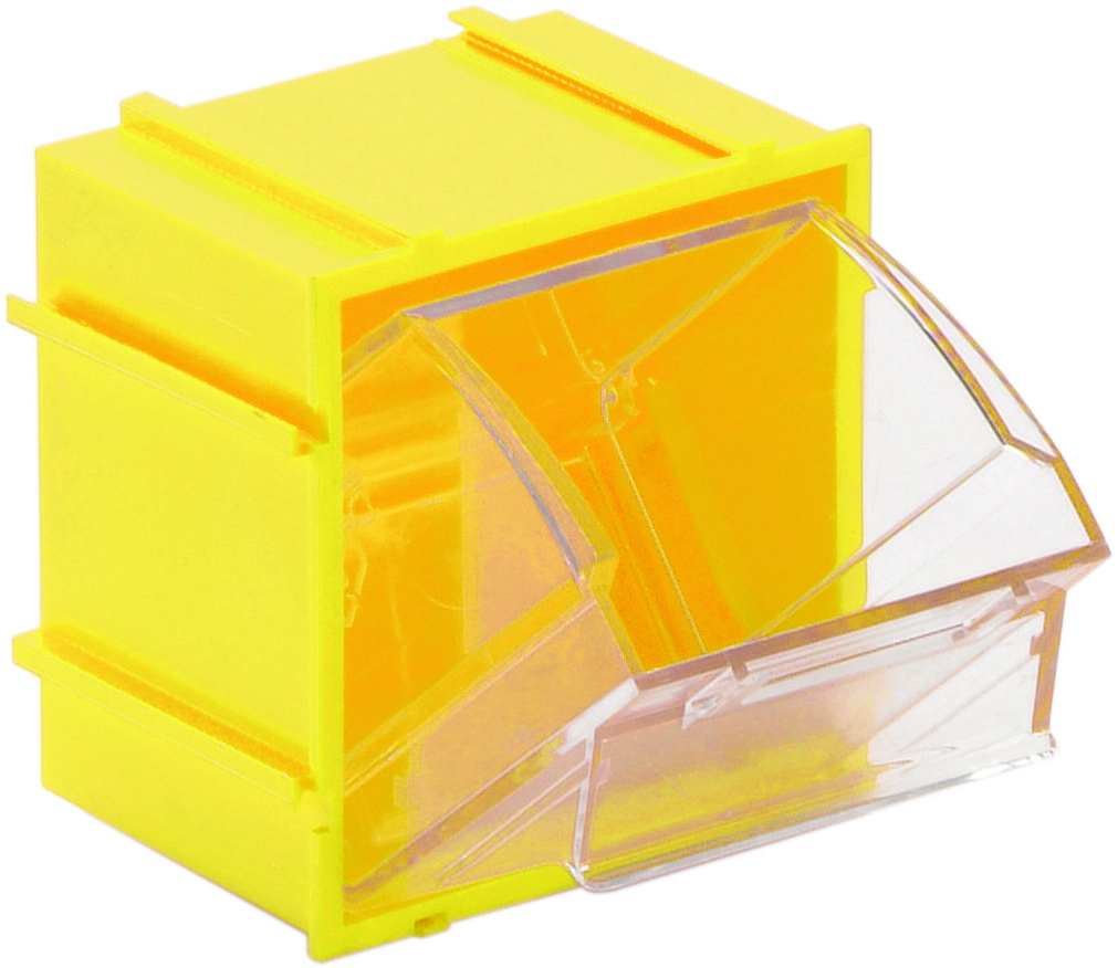 Tip Out Bin, (1) compartment, 2-3/8″W x 2-13/16″D x 3″H, handle with label slot, opens to a 45° angle, plastic clear container, polystyrene yellow cabinet, Made in USA