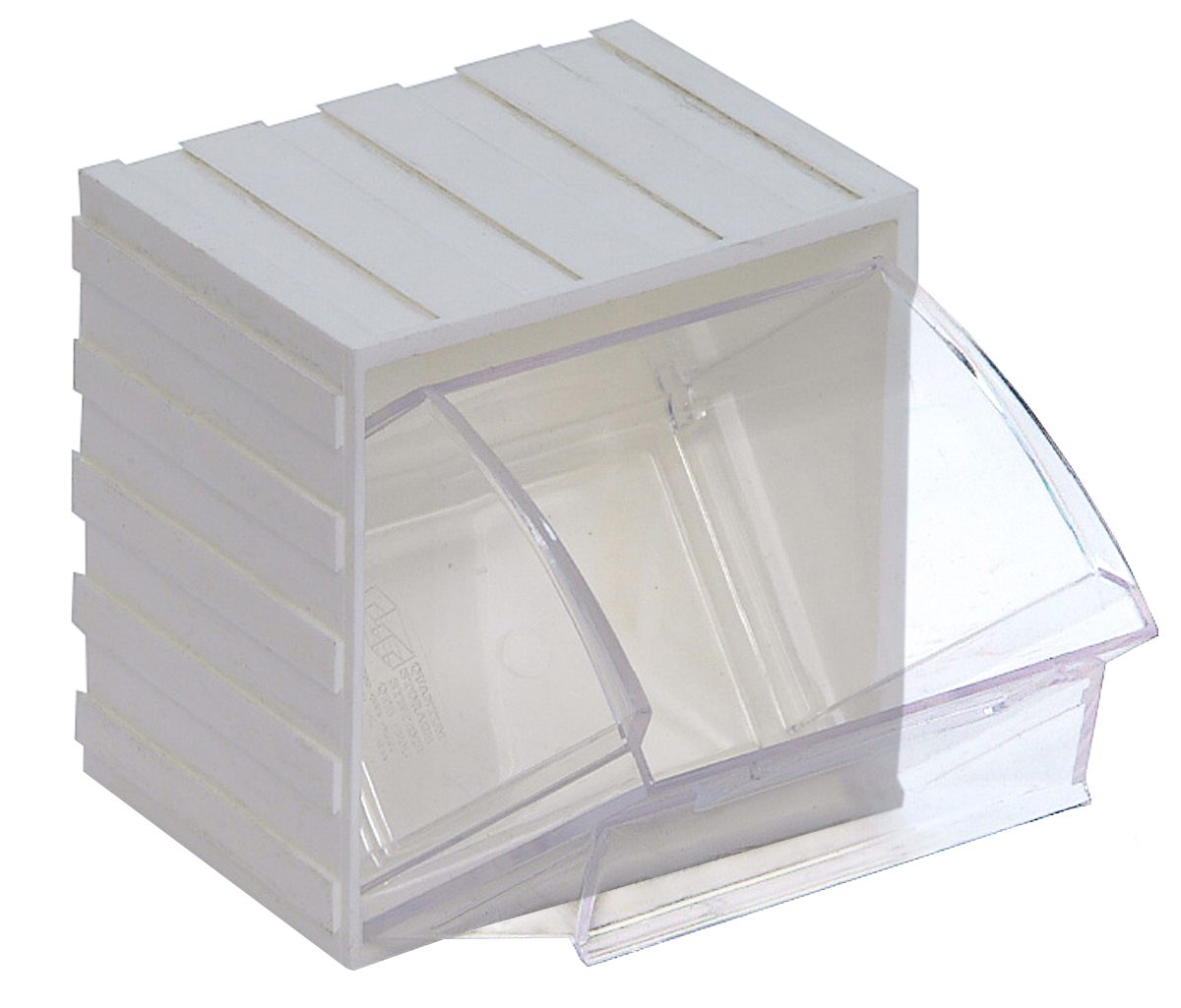 Quantum Tip Out Bin, (1) Compartment, 3-5/8″W X 4-1/16″D X 4-1/4″H, Handle With Label Slot, Opens To A 45° Angle, Plastic Clear Container, Polystyrene White Cabinet, Made In USA