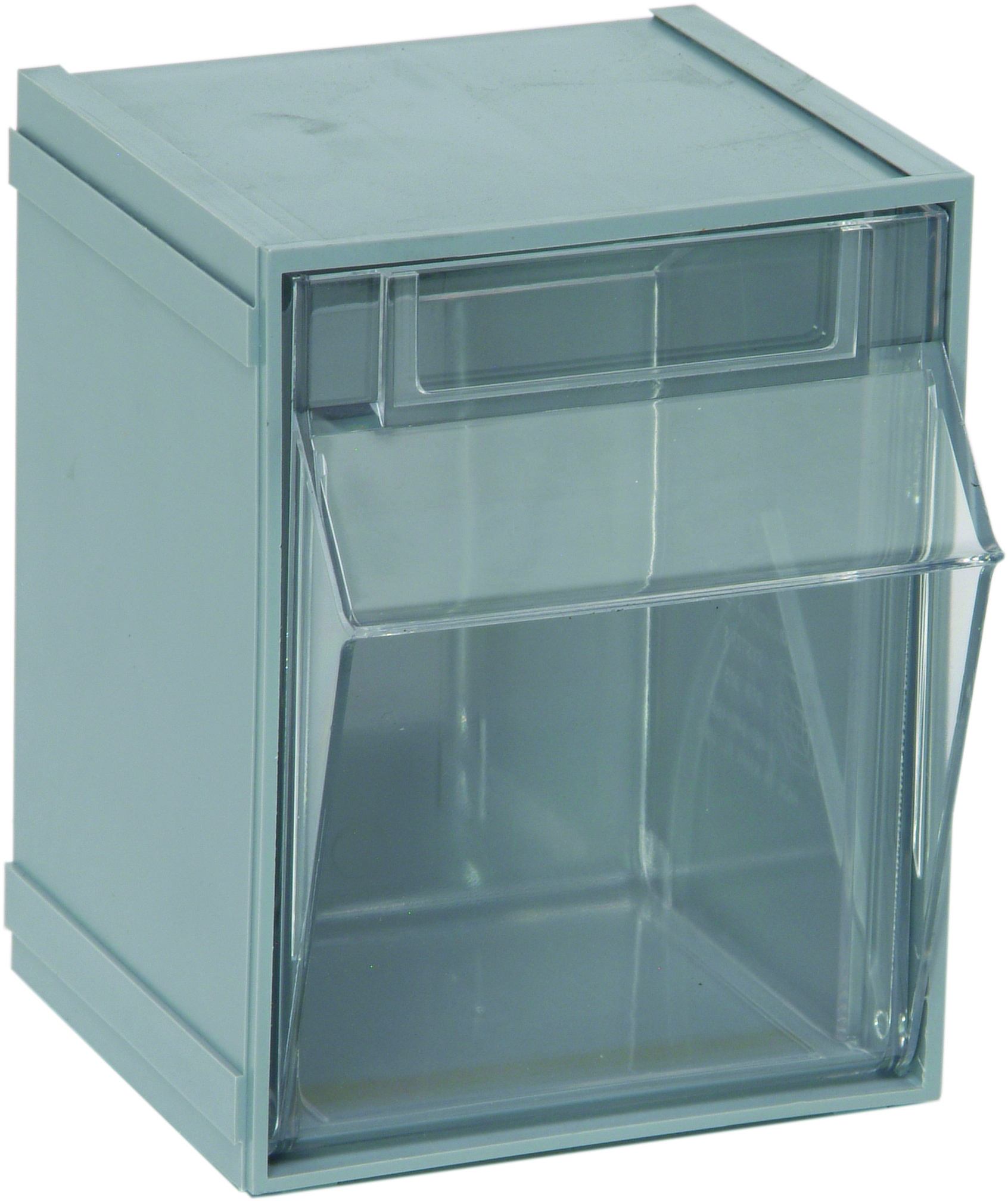 Tip Out Bin, (1) compartment, 5-1/4″W x 4-3/4″D x 6-1/4″H, handle with label slot, opens to a 45° angle, plastic clear container, polystyrene gray cabinet, Made in USA