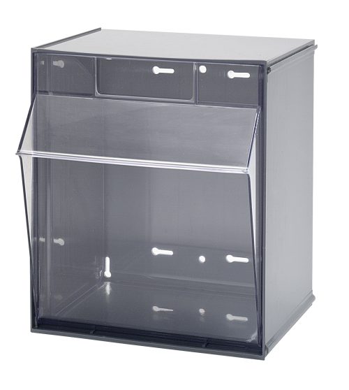 -58%Tip Out Bin, (1) compartment, handle with label slot, opens to a 45° angle, plastic clear container, polystyrene gray cabinet, Made in USA