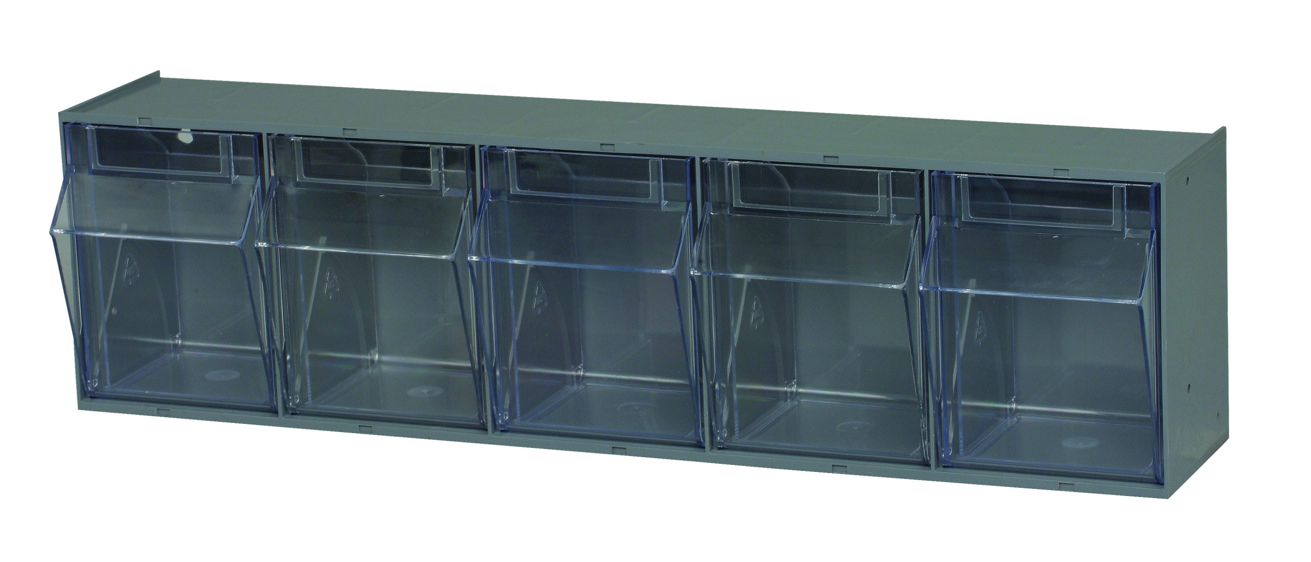 Quantum Tip Out Bin, (5) Compartment, Handle With Label Slot, Opens To A 45° Angle, Plastic Clear Container, Polystyrene Gray Cabinet, Made In USA